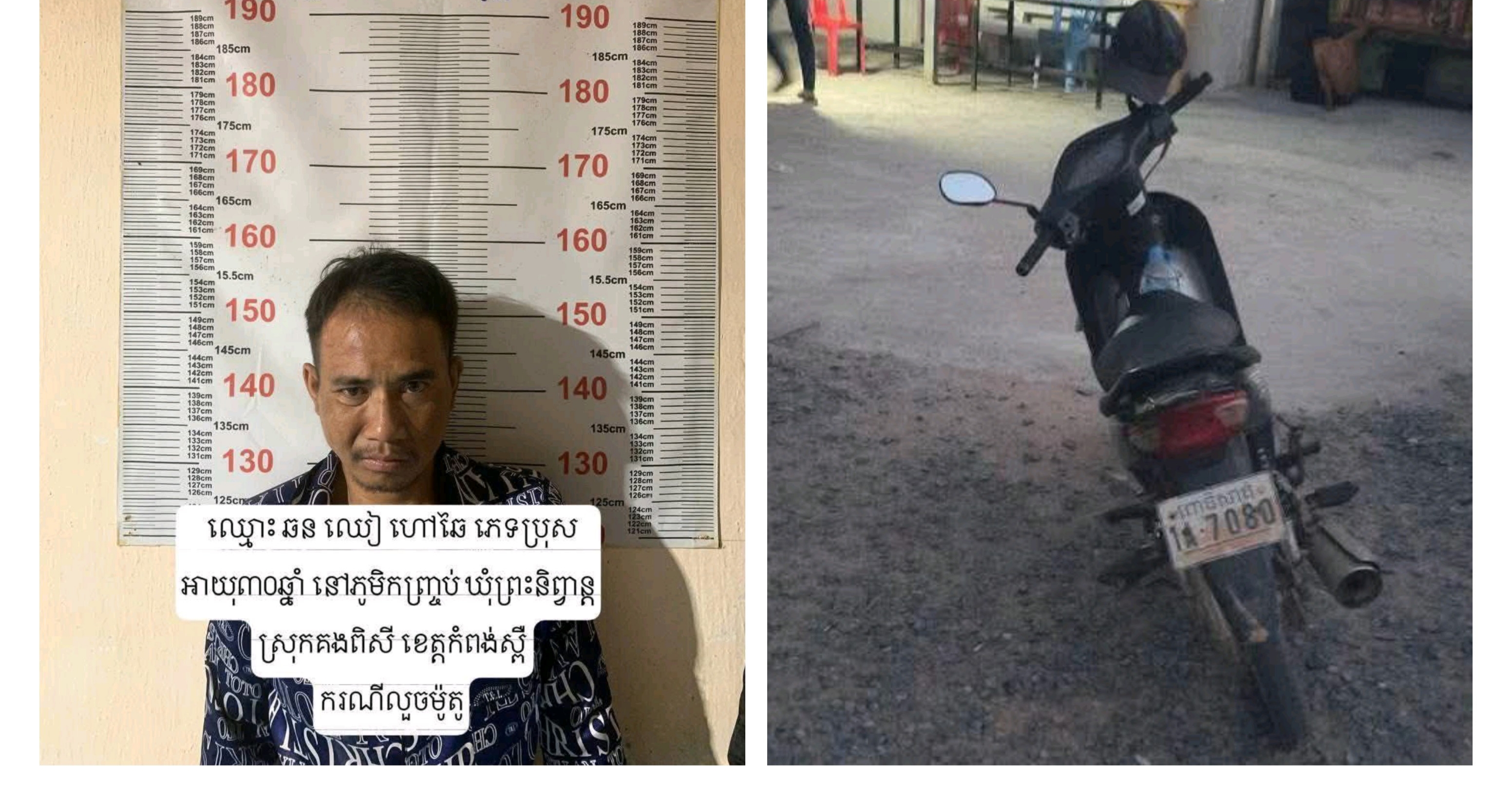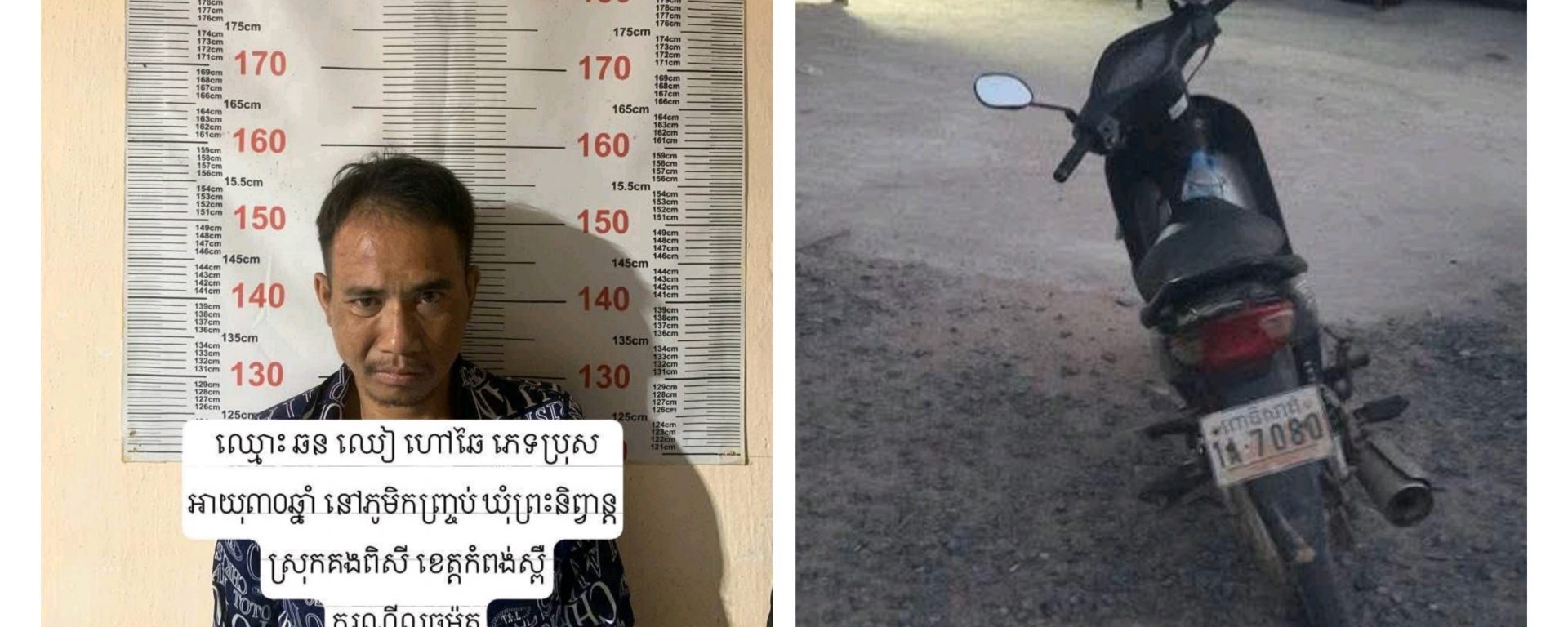 ខេត្តកំពង់ស្ពឺ÷ មន្ត្រីនគរបាលស្រុកគងពិសីបានឲ្យដឹងមួយព្រឹកថ្ងៃទី២៨ខែធ្នូឆ្នាំ២០២៥នេះថា បុរសម្នាក់ជិះម៉ូតូទៅដាក់មង ដោយទុកម៉ូតូចោលនៅលើខ្នងទំនប់ស្រាប់តែចោរឃើញក៏ជិះចេញទៅហើយភ្ញាក់ផ្អើលដល់ប្រជាពលរដ្ឋរកអន្តរាគមន៍ពីកម្លាំងសមត្ថកិច្ចតាមចាប់ បានម៉ូតូមកវិញ។