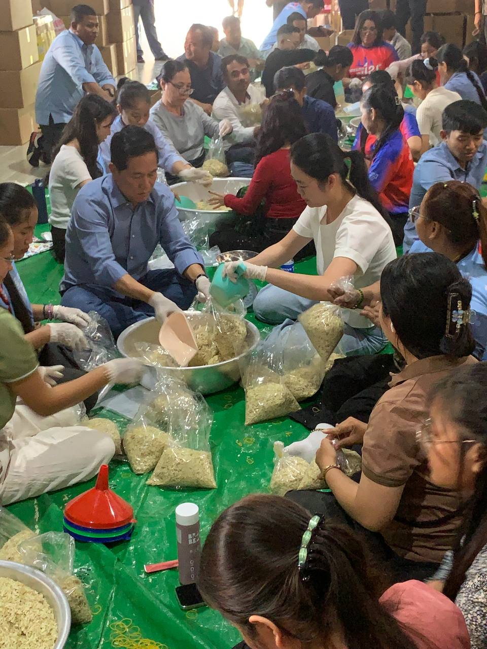 ភ្នំពេញ៖  លោក ឃួង ស្រេង អភិបាលរាជធានីភ្នំពេញ និងភរិយា រួមទាំងមន្ត្រីរដ្ឋបាលរាជធានីភ្នំពេញជាច្រើននាក់ទៀត បានប្រញាប់ប្រញាល់រួសរាន់វេចខ្ចប់អំបុកដាក់ចូលក្នុងថង់កន្លះគីឡូ ដើម្បីងាយស្រួលដឹកយកទៅបែងចែក ដល់ដៃវីរកងទ័ពជួរមុខ និងវីរកងនគរបាលការពារព្រំដែន ព្រមទាំងជនភៀសសឹកផងដែរ។ ពិធីវេចខ្ចប់នេះបានប្រព្រឹត្ដទៅនៅរសៀលថ្ងៃទី២៨ ខែធ្នូ ឆ្នាំ២០២៥ នៅសាលារាជធានីភ្នំពេញ ។