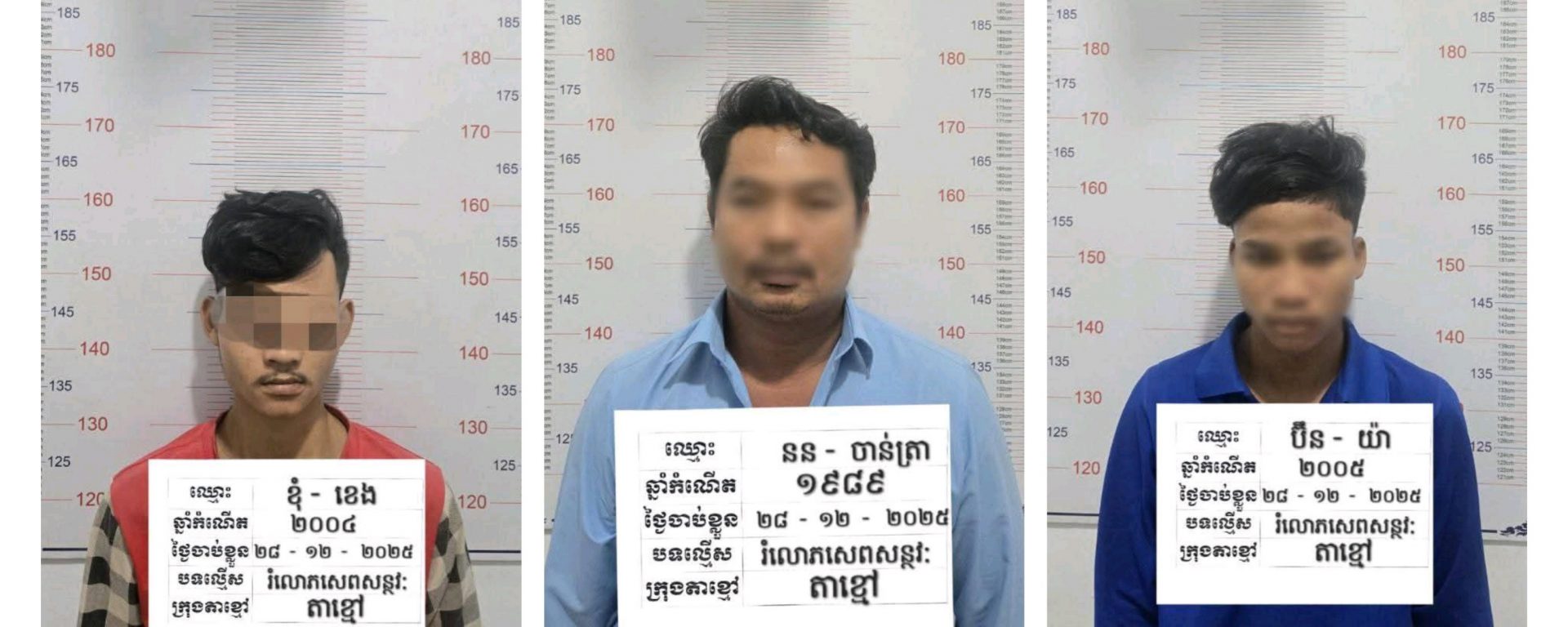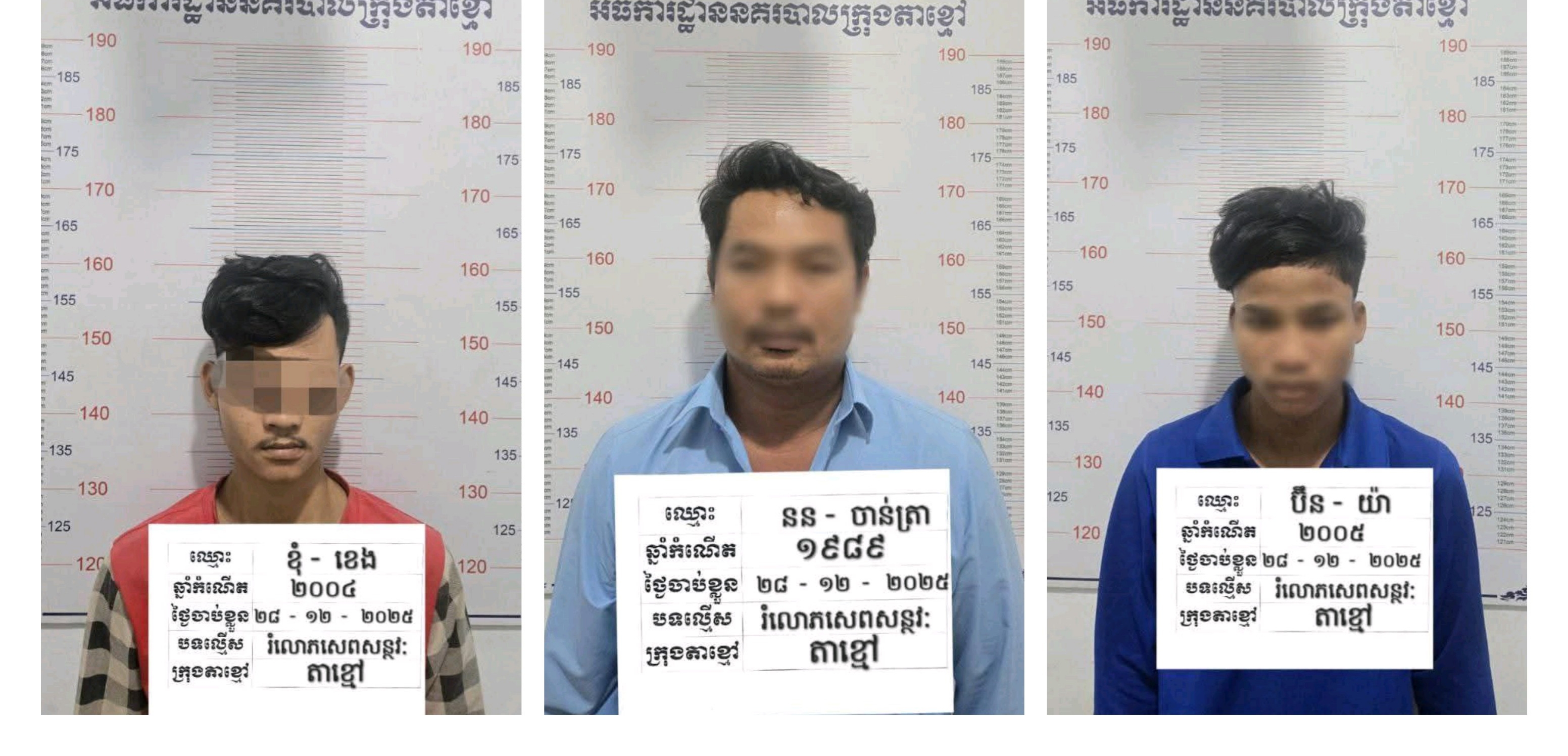 ខេត្តកណ្តាល ÷ ពិតជាប្លែកទៀតហើយ មុននឹងដាច់ឆ្នាំចាស់ផ្លាស់ចូលឆ្នាំថ្មី ដោយបុរសជាជនសង្ស័យ ៣នាក់ ក្នុងនោះម្នាក់ជាអ្នករត់ម៉ូតូកង់បី រីឯ២នាក់ជាមេការផ្ទះ សំណាក់ ករណីរំលោភសេពសន្ថវ:ទៅលើស្ត្រីរងគ្រោះជាភ្ញៀវ ជាថ្នូរនឹងការកាត់កង គ្មានប្រាក់បង់ថ្លៃឈ្នួល និង៣០នាទី ថ្ងៃទី២៦ខែធ្នូឆ្នាំ២០២៥ នៅចំណុចក្នុងផ្ទះសំណាក់បន្ទប់លេខ B999 ស្ថិតក្នុងភូមិខ្ពបវែង សង្កាត់កំពង់សំណាញ់ ក្រុងតាខ្មៅ ខេត្តកណ្តាលហើយត្រូវស្ត្រីរងគ្រោះដាក់ពាក្យបណ្តឹងនៅប៉ុស្តិ៍នគរបាលកំពង់សំណាញ់ ថ្ងៃទី២៨ ខែធ្នូ ឆ្នាំ២០២៥ សមត្ថកិច្ចតាមស្រាវជ្រាវរហូតឃាត់បានបុរសជាជនសង្ស័យ ទាំង៣នាក់ ។
