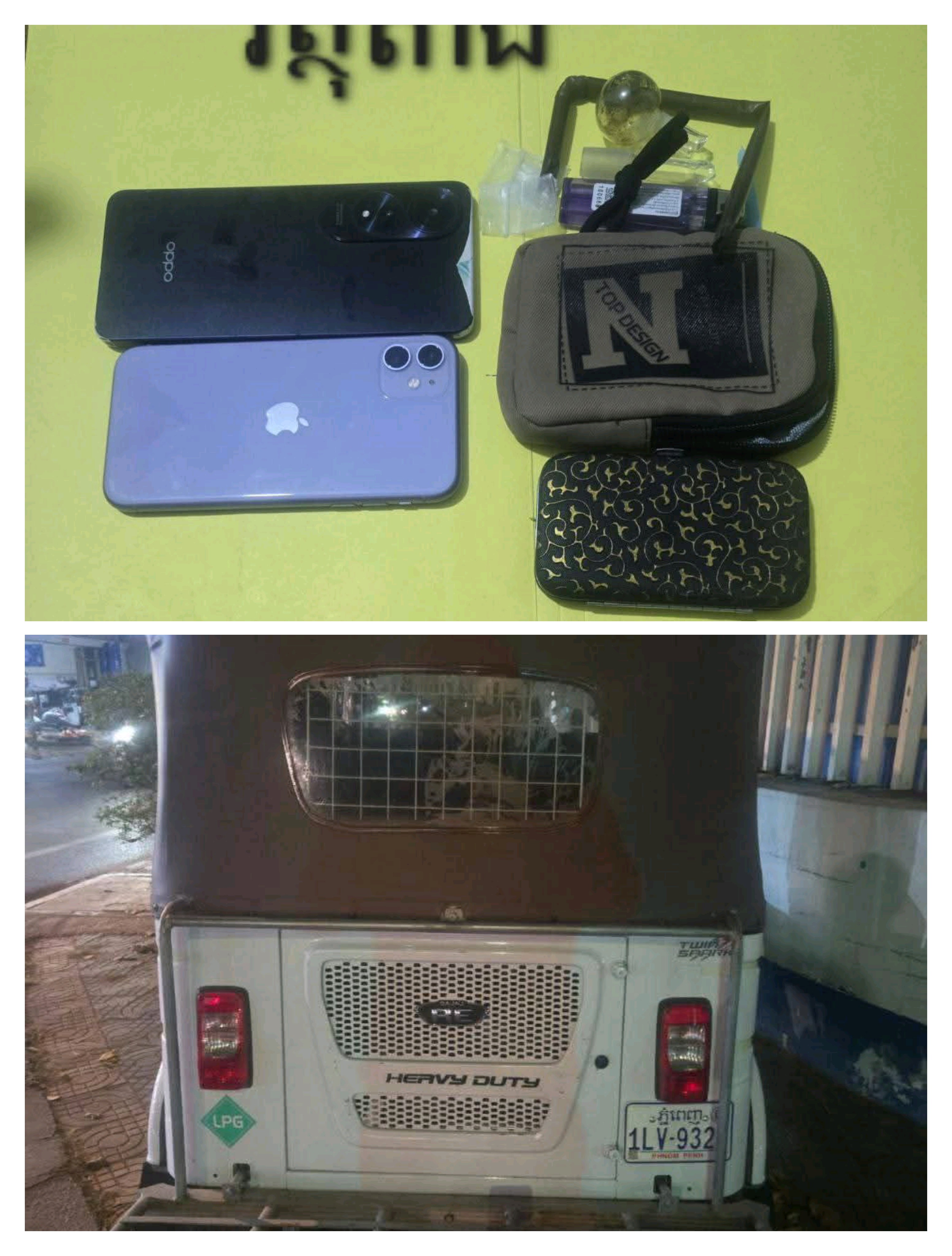 ពណ៍ស ស្លាកលេខភ្នំពេញ2LV- 9321, ទូរសព្ទ័ដៃចំនួន២គ្រឿង , និងសម្ភារៈប្រើប្រាស់គ្រឿងញៀនមួយចំនួន។
