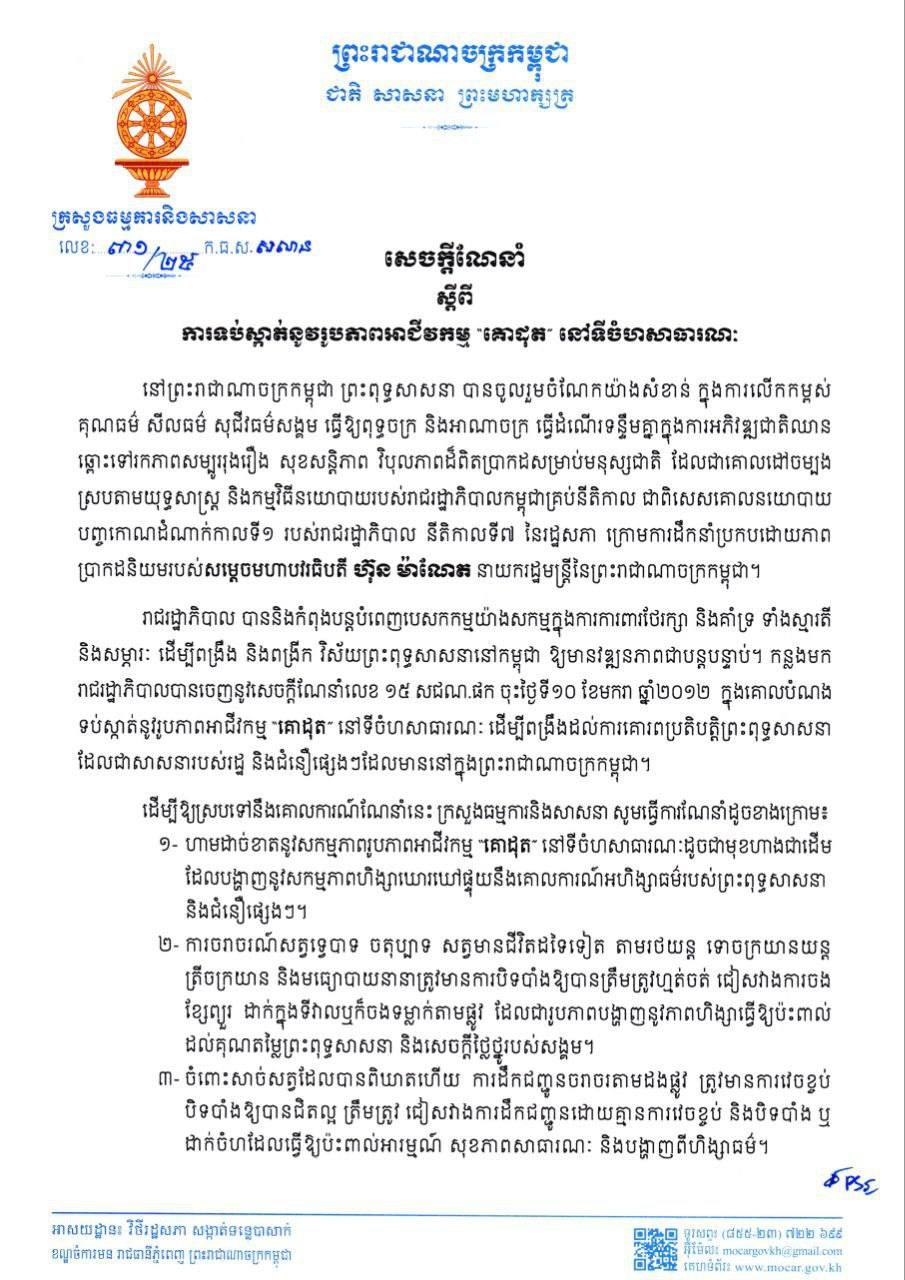 រាជរដ្ឋាភិបាល បាននិងកំពុងបន្តបំពេញបេសកកម្មយ៉ាងសកម្មក្នុងការការពារថែរក្សា និងគាំទ្រ ទាំងស្មារតី និងសម្ភារៈ ដើម្បីពង្រឹង និងពង្រីក វិស័យព្រះពុទ្ធសាសនានៅកម្ពុជា ឱ្យមានវឌ្ឍនភាពជាបន្តបន្ទាប់។ កន្លងមក រាជរដ្ឋាភិបាលបានចេញនូវសេចក្តីណែនាំលេខ ១៥ សជណ.ផក ចុះថ្ងៃទី១០ ខែមករា ឆ្នាំ២០១២ ក្នុងគោលបំណង ទប់ស្កាត់នូវរូបភាពអាជីវកម្ម “គោដុត” នៅទីចំហសាធារណៈ ដើម្បីពង្រឹងដល់ការគោរពប្រតិបត្តិព្រះពុទ្ធសាសនា ដែលជាសាសនារបស់រដ្ឋ និងជំនឿផ្សេងៗដែលមាននៅក្នុងព្រះរាជាណាចក្រកម្ពុជា។