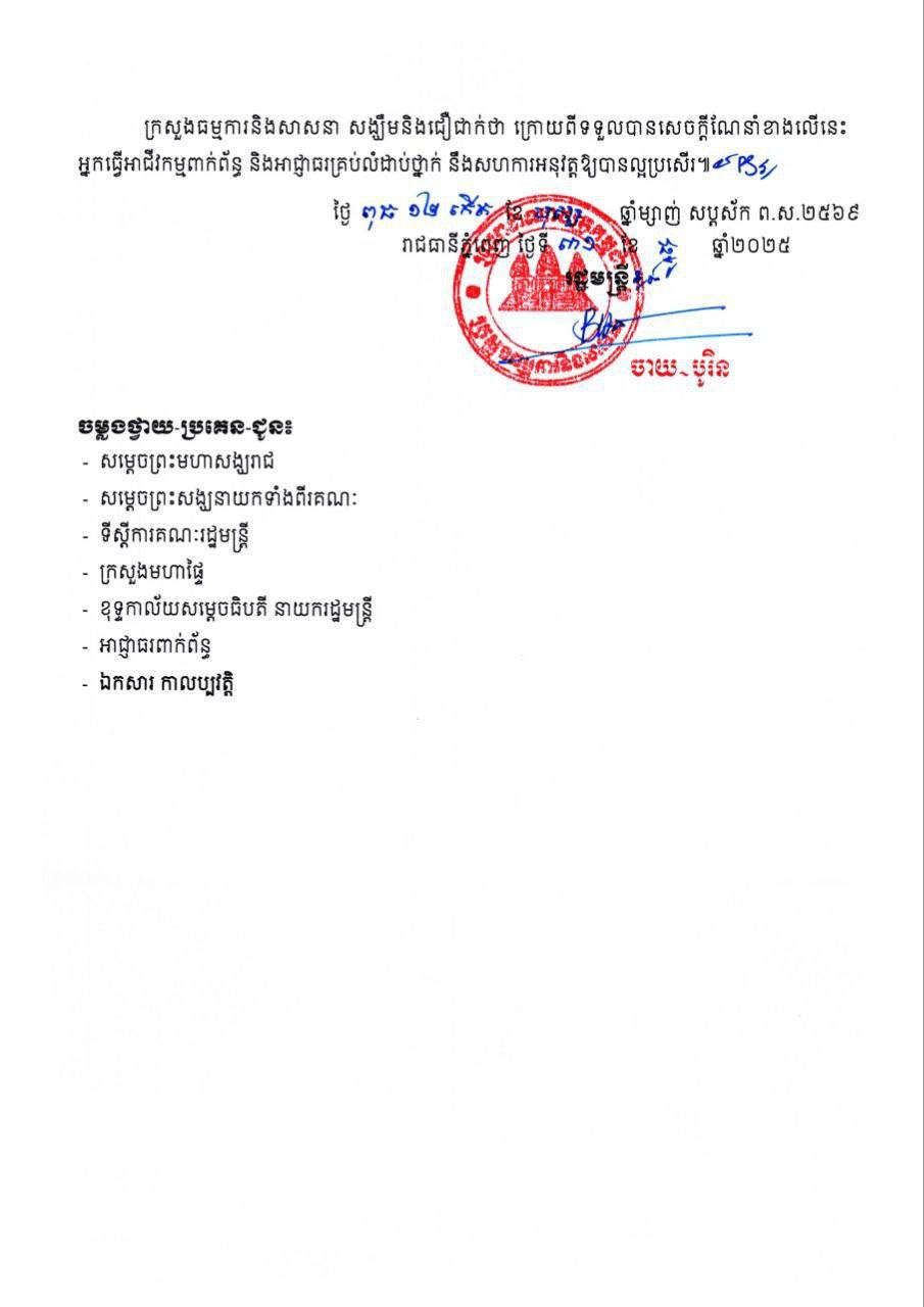 ក្រសួងធម្មការនិងសាសនា សង្ឃឹមនិងជឿជាក់ថា ក្រោយពីទទួលបានសេចក្តីណែនាំខាងលើនេះ អ្នកធ្វើអាជីវកម្មពាក់ព័ន្ធ និងអាជ្ញាធរគ្រប់លំដាប់ថ្នាក់ នឹងសហការអនុវត្តឱ្យបានល្អប្រសើរ៕ដោយ៖តារា