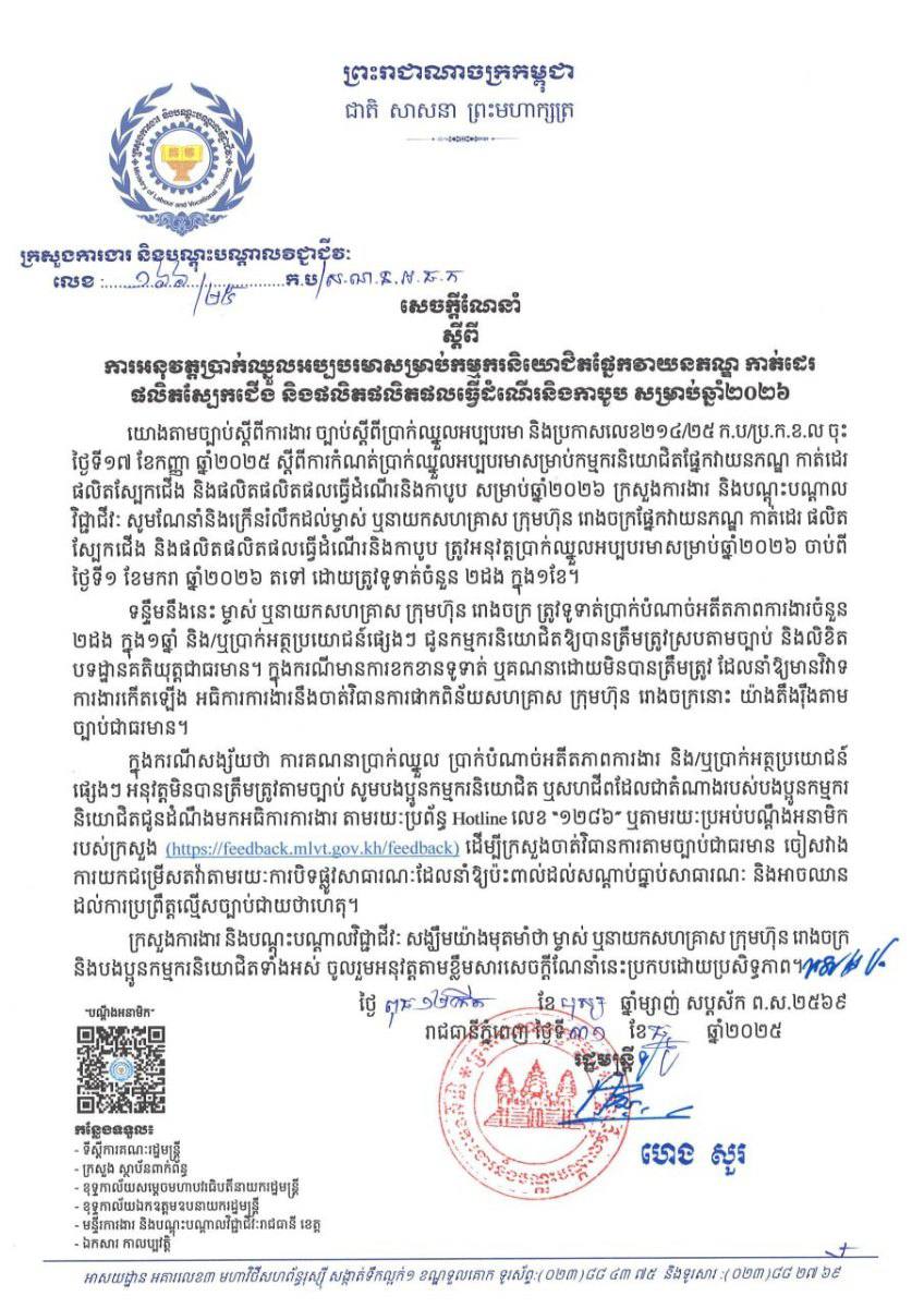 យោងតាមច្បាប់ស្តីពីការងារ ច្បាប់ស្តីពីប្រាក់ឈ្នួលអប្បបរមា និងប្រកាសលេខ២១៤/២៥ ក.ប/ប្រ.ក.ខ.ល ចុះ ថ្ងៃទី១៧ ខែកញ្ញា ឆ្នាំ២០២៥ ស្តីពីការកំណត់ប្រាក់ឈ្នួលអប្បបរមាសម្រាប់កម្មករនិយោជិតផ្នែកវាយនភណ្ឌ កាត់ដេរ ផលិតស្បែកជើង និងផលិតផលិតផលធ្វើដំណើរនិងកាបូប សម្រាប់ឆ្នាំ២០២៦ ក្រសួងការងារ និងបណ្តុះបណ្តាល វិជ្ជាជីវៈ បានណែនាំ និងក្រើនរំលឹកដល់ម្ចាស់ ឬនាយកសហគ្រាស ក្រុមហ៊ុន រោងចក្រផ្នែកវាយនភណ្ឌ កាត់ដេរ ផលិត ស្បែកជើង និងផលិតផលិតផលធ្វើដំណើរ និងកាបូប ត្រូវអនុវត្តប្រាក់ឈ្នួលអប្បបរមាសម្រាប់ឆ្នាំ២០២៦ ចាប់ពី ថ្ងៃទី១ ខែមករា ឆ្នាំ២០២៦ តទៅ ដោយត្រូវទូទាត់ចំនួន ២ដង ក្នុង១ខែ។