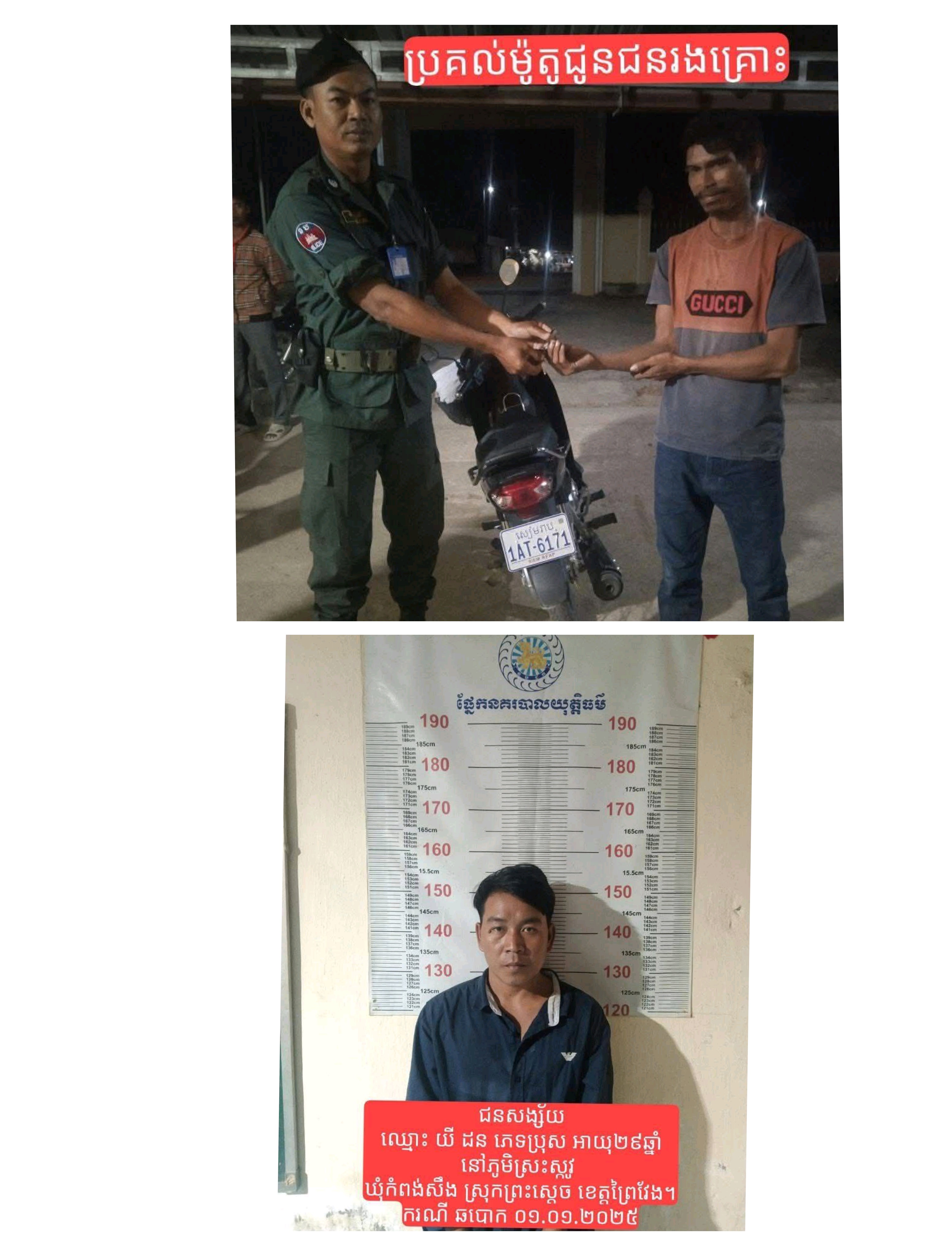 មន្ត្រីនគរបាលស្រុកគងពិសីបានឲ្យដឹងថា កាលថ្ងៃទី១ ខែមករា ឆ្នាំ ២០២៦ មានករណីឆបោកម៉ូតអ្នកធ្វើការសំណង់ជាមួយគ្នា ។ នៅចំណុចការដ្ឋានសំណង់ ស្ថិត នៅភូមិព្រៃពង្រ ឃុំរកាកោះ ស្រុកគងពិសី ខេត្តកំពង់ស្ពឺ ដោយវេលាម៉ោង១៨និង៣០នាទី មានឈ្មោះ យី ដន ភេទប្រុស អាយុ ២៦ ឆ្នាំ រស់នៅភូមិក្រាស់ស្ពវ ឃុំកំពង់សឹង ស្រុកព្រះស្តេច ខេត្តព្រៃវែង ជាអ្នកសំណង់ជាមួយគ្នា បានខ្ចីម៉ូតូ ម៉ាកសង់ឌ្រីម C125 ពណ៌ខ្មៅ ផលិតឆ្នាំ2025 ពាក់ផ្លាកលេខ សៀមរាប1AT.6171 លេខតួ លេខម៉ាសុីនND125N0263213 ពីម្ចាស់ម៉ូតូឈ្មោះ រស់ រេង ភេទប្រុស អាយុ ៣៤ឆ្នាំ បច្ចុប្បន្នស្នាក់ នៅភូមិក្រាំងស្វាយ ឃុំរលាំងគ្រើល ស្រុកសំរោងទង ខេត្តកំពង់ស្ពឺ ថាយកទៅទិញស្រាបៀមួយភ្លែត រួចជិះទៅបាត់រហូត។
