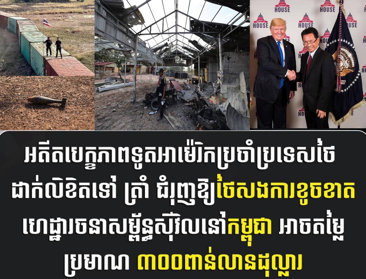 អាម៉េរិក៖ លោក Leewood Phu អតីតបេក្ខភាពទូតអាម៉េរិកប្រចាំប្រទេសថៃ នៅថ្ងៃទី០៥ ខែមករា ឆ្នាំ២០២៦នេះ បានដាក់លិខិតជូនលោក ដូណាល់ ត្រាំ ប្រធានាធិបតីសហរដ្ឋអាម៉េរិក ឱ្យផ្តល់ការណែនាំ និងអនុសាសន៍ ទាក់ទងនឹងក្រុមហ៊ុនអាម៉េរិកដែលមានបទពិសោធន៍ និងជំនាញច្បាស់លាស់ ក្នុងការកសាងកម្ពុជាឡើងវិញ ក្រោយរងការបំផ្លិចបំផ្លាញដោយការឈ្លានពានរបស់យោធាថៃ មានចំនួនប្រហែល ៣០០ ពាន់លានដុល្លារ ដែលឆ្លុះបញ្ចាំងពីទំហំនៃការខូចខាតដល់ហេដ្ឋារចនាសម្ព័ន្ធ លំនៅដ្ឋាន និងសេវាសាធារណៈសំខាន់ៗ។