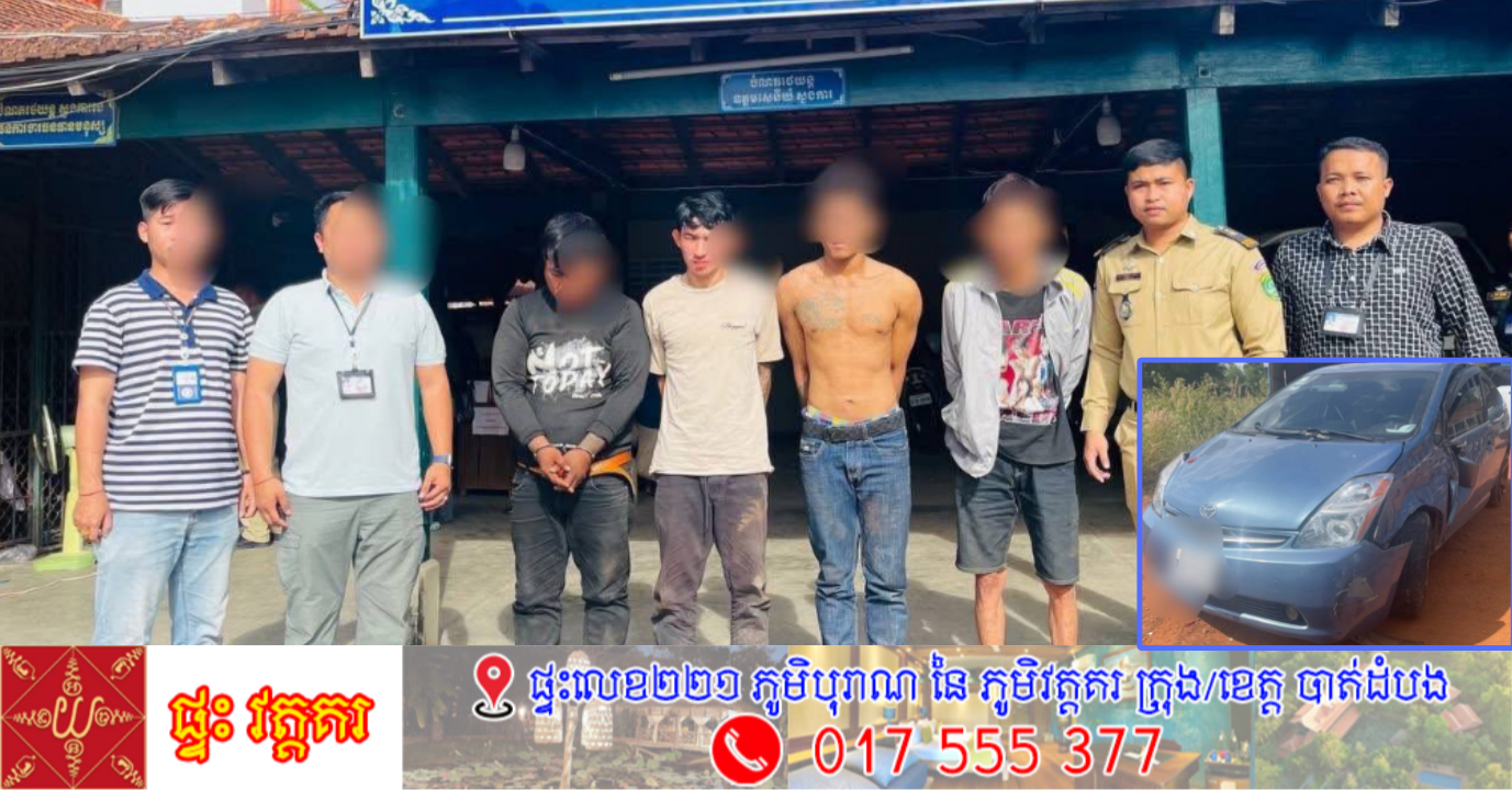ហេតុការណ៍៖ កាលពីថ្ងៃទី០៤ ខែមករា ឆ្នាំ២០២៦ វេលាម៉ោង២១និង៣០នាទី ជនរងគ្រោះឈ្មោះ គ្រី រីកូ ភេទប្រុស អាយុ៤៦ឆ្នាំ បានទុករថយន្ត០១គ្រឿង ម៉ាក Prius នៅមុខផ្ទះលេខ៣៥B ផ្លូវលេខ២B បុរីលឹមឈាងហាក់ ស្ថិតនៅភូមិម័ល សង្កាត់ដង្កោ ខណ្ឌដង្កោ រាជធានីភ្នំពេញ ដោយបានចាក់សោទ្វាររថយន្តត្រឹមត្រូវ រួចជនរងគ្រោះក៏បានចូលសម្រាកក្នុងផ្ទះ ។ លុះរហូតដល់វេលាម៉ោង០៤និង១៥នាទី ថ្ងៃទី០៥ ខែមករា ឆ្នាំ២០២៦ ជនរងគ្រោះបានក្រោកពីដេកចេញទៅមើលរថយន្ត ស្រាប់តែបាត់រថយន្តពីកន្លែងទុក ហើយជនរងគ្រោះក៏បានមករាយការណ៍ប្រាប់សមត្ថកិច្ច ប៉ុស្តិ៍នគរបាលរដ្ឋបាលដង្កោ ឱ្យជួយអន្តរាគមន៍ ។ សមត្ថកិច្ចក៏បានចុះធ្វើការស្រាវជ្រាវតាមជំនាញគឺឃើញសកម្មភាពជនសង្ស័យលួចរថយន្តរបស់ជនរងគ្រោះនៅវេលាម៉ោង០២និង២៥នាទី យប់អធ្រាត្រថ្ងៃទី០៥ ខែមករា ឆ្នាំ២០២៦ រួចសមត្ថកិច្ចក៏បានចុះសហការជាមួយស្នងការដ្ឋាននគរបាលខេត្តកំពត ធ្វើការឃាត់ខ្លួនជនសង្ស័យបានចំនួន០៤នាក់ ខាងលើ រួមនិងវត្ថុតាង បញ្ជូនមកអធិការដ្ឋាននគរបាលខណ្ឌដង្កោដើម្បីចាត់លារតាមនីតិវិធី៕