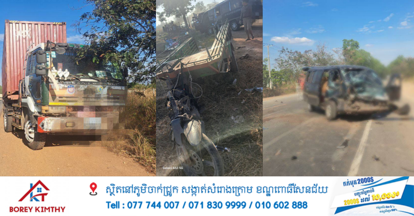 ខេត្តកំពង់ស្ពឺ: ករណី “ គ្រោះថ្នាក់ចរាចរណ៍“ រវាងរថយន្ត និងម៉ូតូសណ្តោងបុកគ្នាខ្ទាតមនុស្សចូលរថយន្តកុងតឺន័រកិនបុរសម្នាក់បណ្ដាលឲ្យបានស្លាប់ និងបុរសម្នាក់ រងរបួសធ្ងន់។