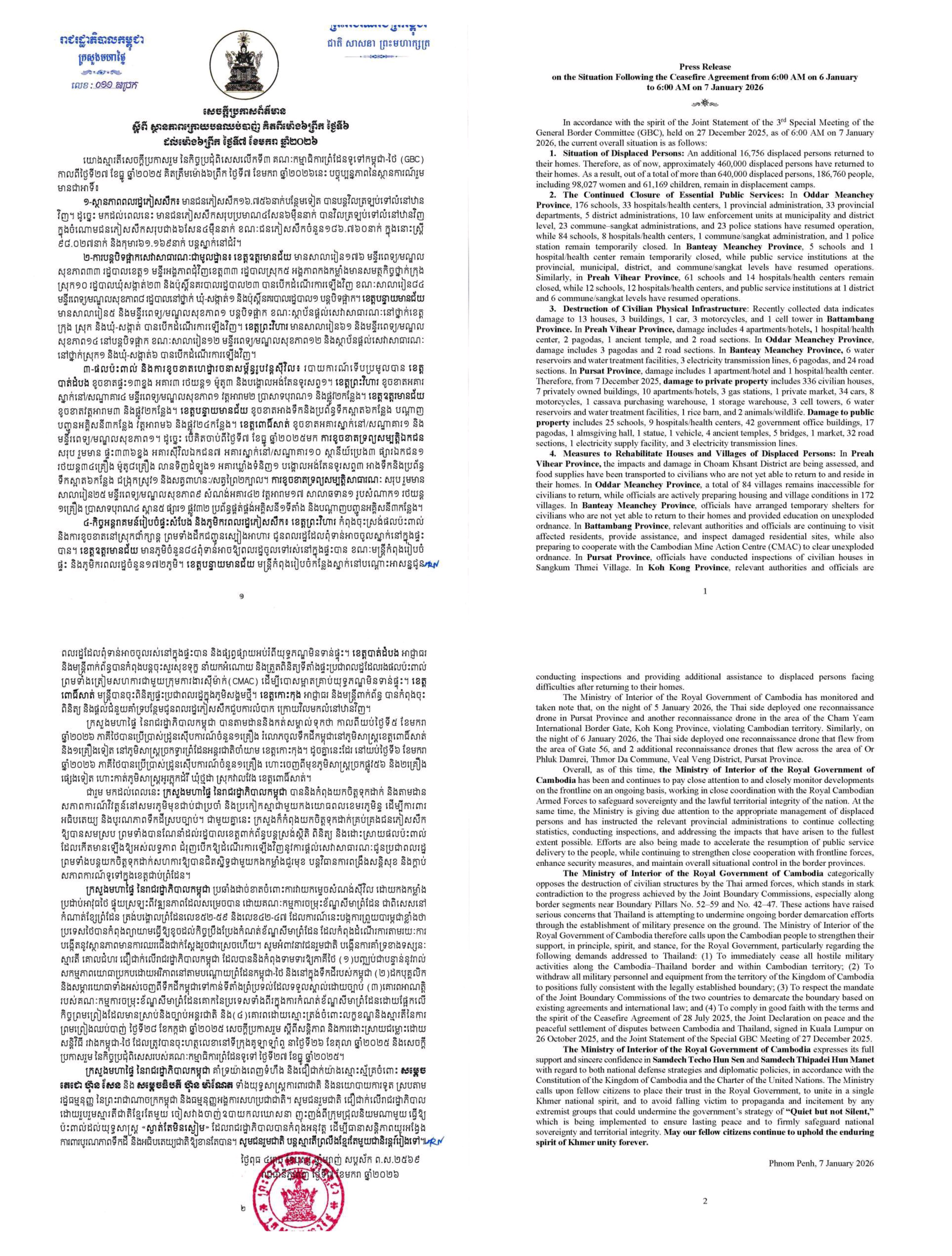 ភ្នំពេញ៖ ក្រសួងមហាផ្ទៃ នៃរាជរដ្ឋាភិបាលកម្ពុជា បានឱ្យដឹងថា យោងស្មារតីសេចក្តីប្រកាសរួម នៃកិច្ចប្រជុំពិសេសលើកទី៣ គណៈកម្មាធិការព្រំដែនទូទៅកម្ពុជា-ថៃ (GBC) កាលពីថ្ងៃទី២៧ ខែធ្នូ ឆ្នាំ២០២៥ គិតត្រឹមម៉ោង៦ព្រឹក ថ្ងៃទី៧ ខែមករា ឆ្នាំ២០២៦នេះ បច្ចុប្បន្នភាពនៃស្ថានការណ៍រួម មានជាអាទិ៍៖