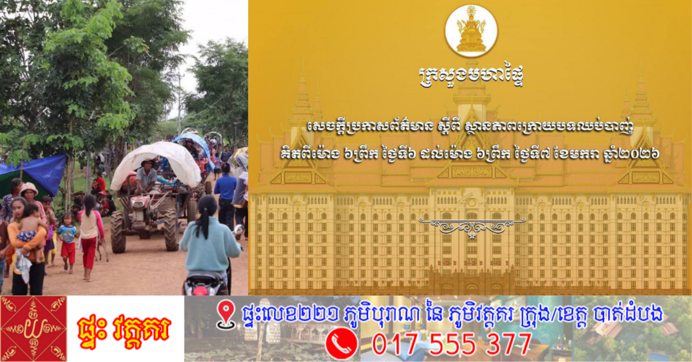 ក្រសួងមហាផ្ទៃ នៃរាជរដ្ឋាភិបាលកម្ពុជា ប្រឆាំងដាច់ខាតចំពោះការវាយកម្ទេចសំណង់ស៊ីវិល ដោយកងកម្លាំង ប្រដាប់អាវុធថៃ ផ្ទុយស្រឡះពីវឌ្ឍនភាពដែលសម្រេចបាន ដោយគណៈកម្មការចម្រុះខ័ណ្ឌសីមាព្រំដែន ជាពិសេសនៅ កំណាត់ខ្សែព្រំដែន ត្រង់បង្គោលព្រំដែនលេខ៥២-៥៩ និងលេខ៤២-៤៧ ដែលការណ៍នេះបង្កការព្រួយបារម្ភជាខ្លាំងថា ប្រទេសថៃបានកំពុងព្យាយាមធ្វើឱ្យខូចដល់កិច្ចប្រឹងប្រែងកំណត់ខ័ណ្ឌសីមាព្រំដែន ដែលកំពុងដំណើរការតាមរយៈការ បង្កើតនូវស្ថានភាពមានការឈរជើងជាក់ស្តែងរួចជាស្រេចហើយ។ សូមអំពាវនាវជនរួមជាតិ បង្កើនការគាំទ្រខាងទស្សនៈ ស្មារតី គោលជំហរ ជឿជាក់លើរាជរដ្ឋាភិបាលកម្ពុជា ដែលបាននិងកំពុងទាមទារឱ្យភាគីថៃ (១)បញ្ឈប់ជាបន្ទាន់នូវរាល់ សកម្មភាពយោធាប្រកបដោយអរិភាពនៅតាមបណ្តោយព្រំដែនកម្ពុជា-ថៃ និងនៅក្នុងទឹកដីរបស់កម្ពុជា (២)ដកបុគ្គលិក និងសម្ភារយោធាទាំងអស់ចេញពីទឹកដីកម្ពុជាទៅកាន់ទីតាំងព្រំប្រទល់ដែលទទួលស្គាល់ដោយច្បាប់ (៣)គោរពអាណត្តិ របស់គណៈកម្មការចម្រុះខ័ណ្ឌសីមាព្រំដែនគោកនៃប្រទេសទាំងពីរក្នុងការកំណត់ខ័ណ្ឌសីមាព្រំដែនដោយផ្អែកលើ កិច្ចព្រមព្រៀងដែលមានស្រាប់និងច្បាប់អន្តរជាតិ និង(៤)គោរពដោយស្មោះត្រង់ចំពោះលក្ខខណ្ឌនិងស្មារតីនៃការ ព្រមព្រៀងឈប់បាញ់ ថ្ងៃទី២៨ ខែកក្កដា ឆ្នាំ២០២៥ សេចក្តីប្រកាសរួម ស្តីពីសន្តិភាព និងការដោះស្រាយជម្លោះដោយ សន្តិវិធី រវាងកម្ពុជា-ថៃ ដែលត្រូវបានចុះហត្ថលេខានៅទីក្រុងគូឡាឡាំពួ នាថ្ងៃទី២៦ ខែតុលា ឆ្នាំ២០២៥ និងសេចក្តី ប្រកាសរួម នៃកិច្ចប្រជុំពិសេសរបស់គណៈកម្មាធិការព្រំដែនទូទៅ ថ្ងៃទី២៧ ខែធ្នូ ឆ្នាំ២០២៥។
