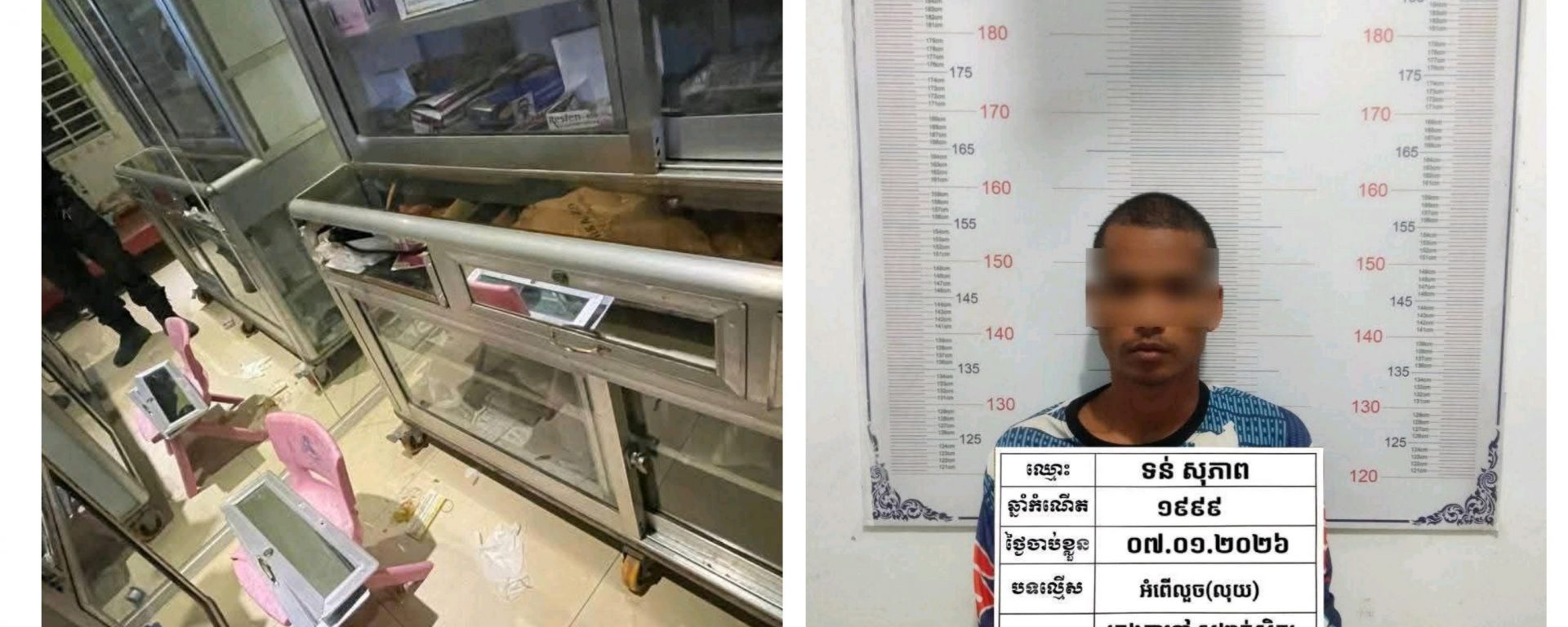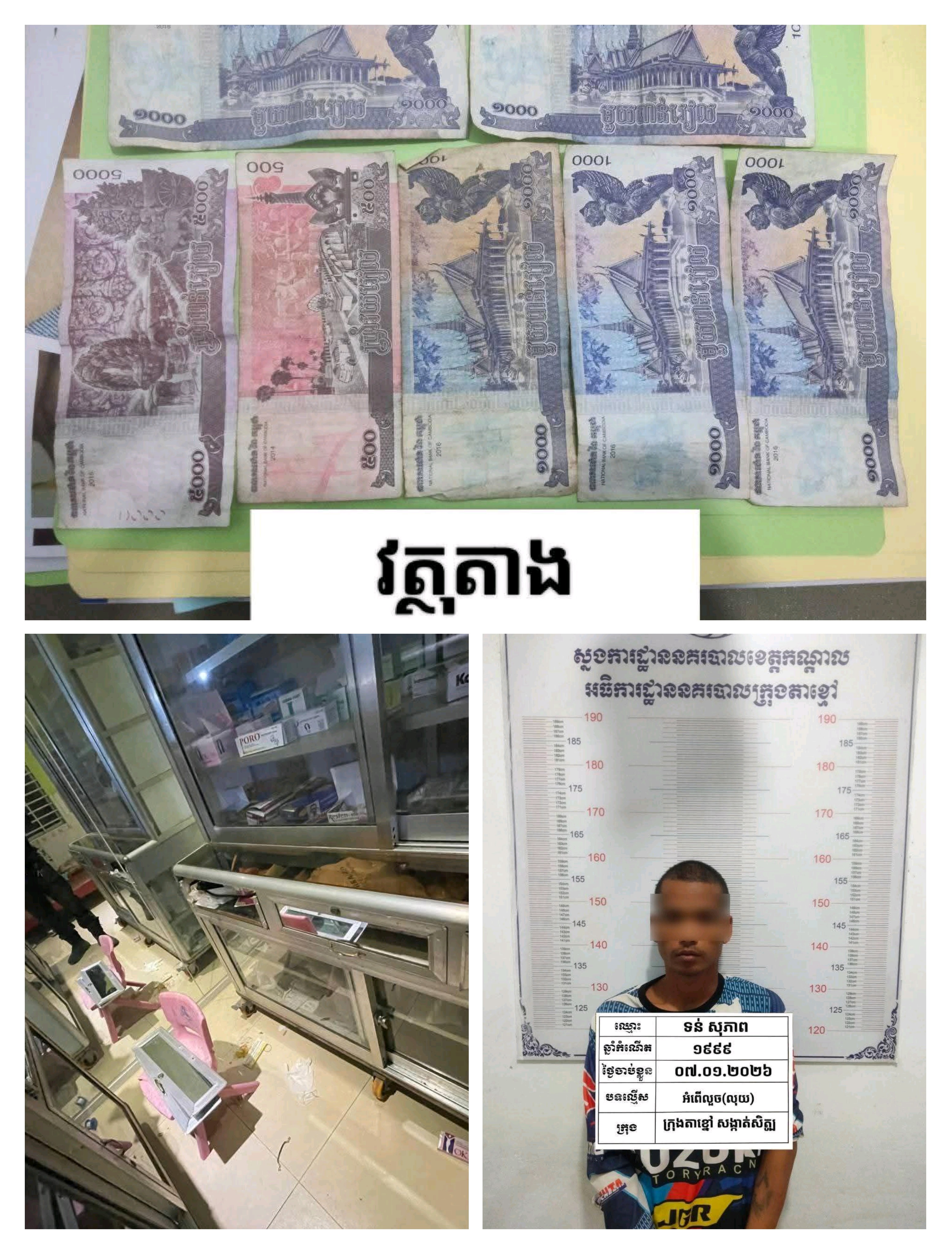 ខេត្តកណ្ដាល៖ ជនសង្ស័យម្នាក់ដែលញៀនថ្នាំឆ្លៀតឱកាសម្ចាស់ឱសថស្ថានរវល់យកកូនទៅឱ្យមេដោះនៅក្រោយផ្ទះ មួយភ្លែតចូលលួចយកលុយសម្រាប់អាប់ឱ្យភ្ញៀវបានសម្រេច ប៉ុន្តែគេចខ្លួនមិនទាន់ផុតផង ក៏ត្រូវម្ចាស់មកទាន់ចាប់ឃាត់ខ្លួនប្រគល់ឲ្យសមត្ថកិច្ច។ ហេតុការណ៍នេះបានកើតឡើងនៅវេលាម៉ោង១៩និង៣០នាទី ថ្ងៃទី៧ ខែមករា ឆ្នាំ២០២៦ នៅចំណុចផ្ទះលក់ថ្នាំពេទ្យមួយកន្លែង ស្ថិតក្នុងភូមិសិត្បូ សង្កាត់សិត្បូ ក្រុងតាខ្មៅ ខេត្តកណ្តាល។