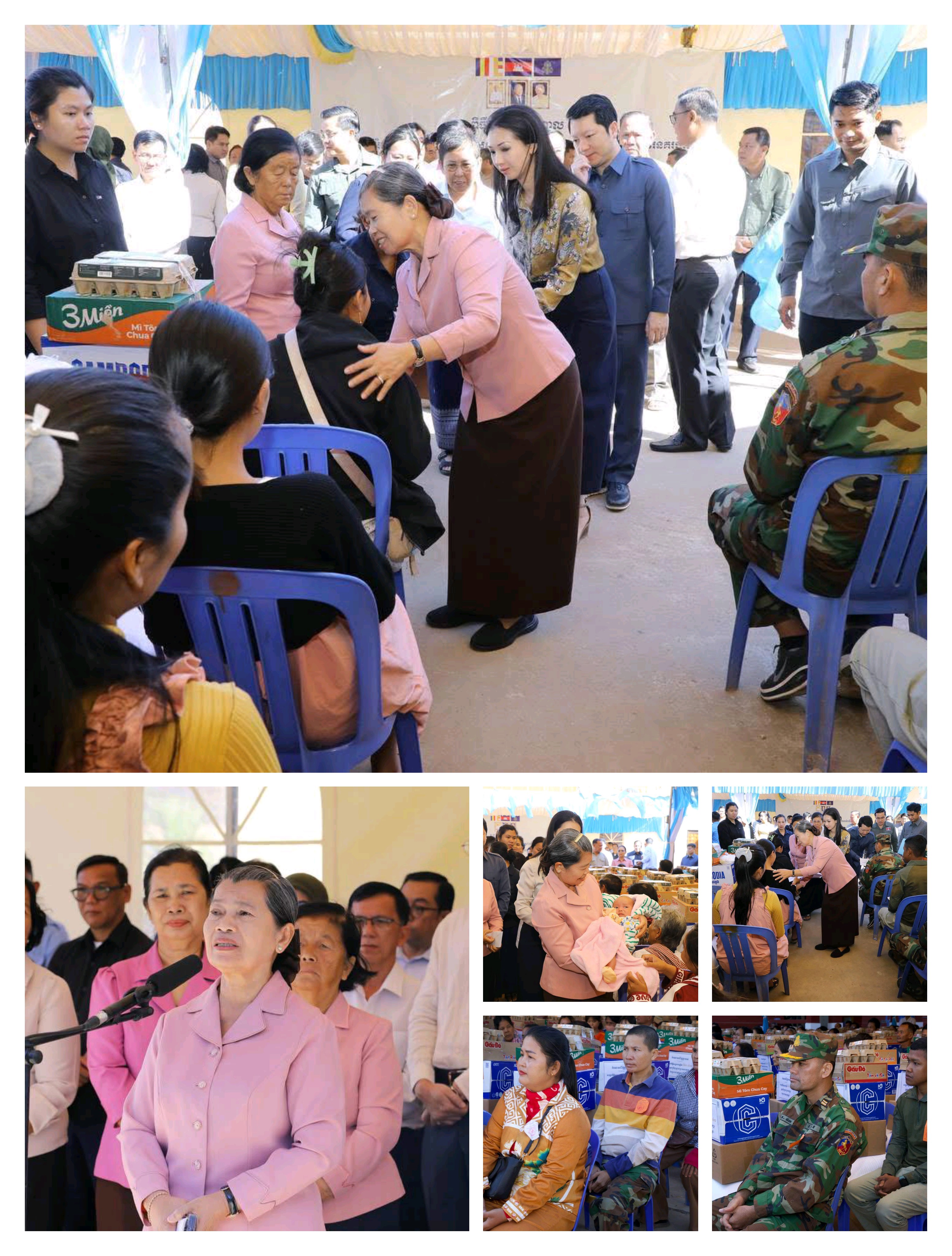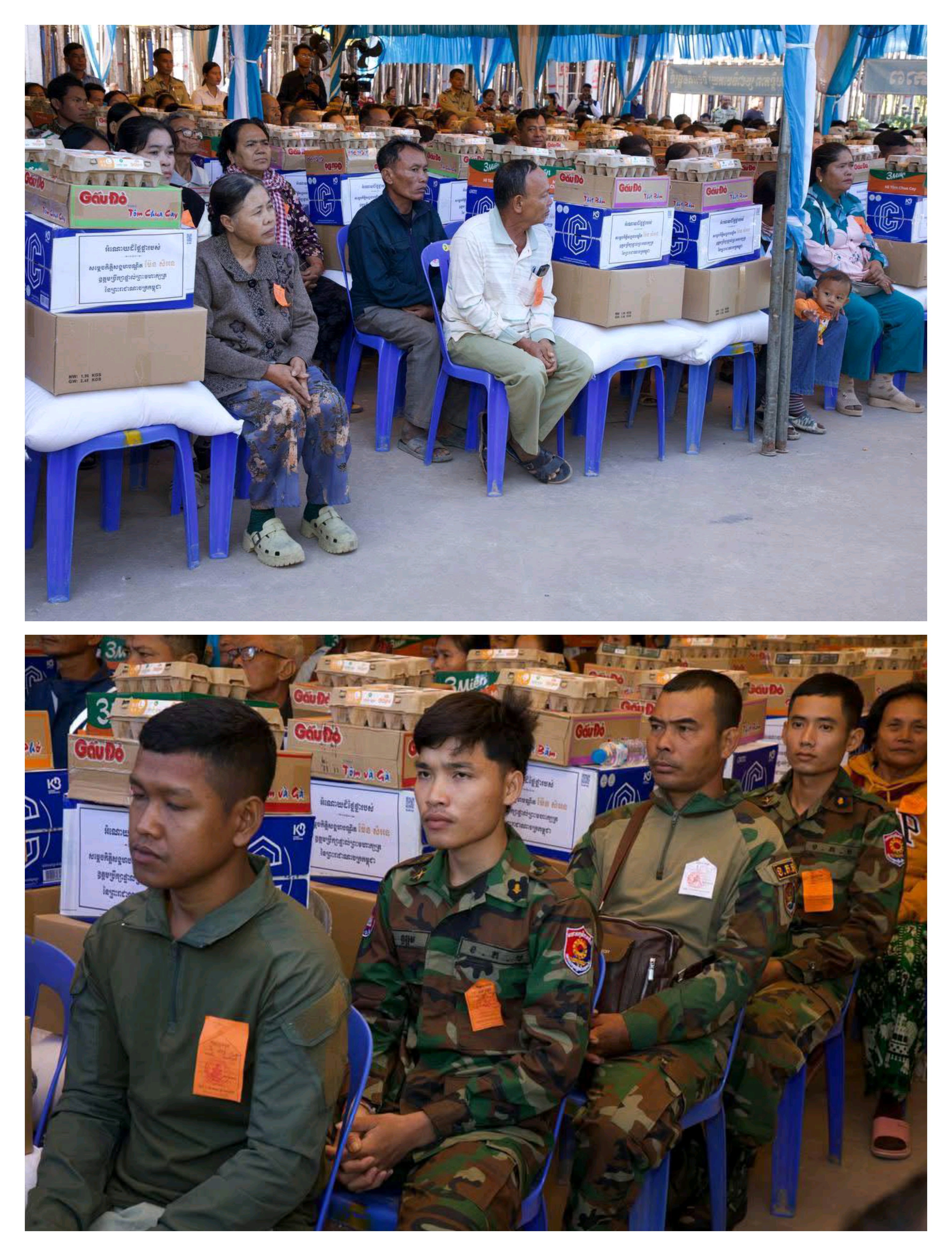 អំណោយសម្រាប់ជនភៀសសឹកព្រមទាំងក្រុមគ្រួសារវីរៈកងទ័ព និងវីរៈនគរបាលក្នុងថ្ងៃនេះមានចំនួន ៤៦៧គ្រួសារ ក្នុងមួយគ្រួសារទទួលបាន៖ អង្ករ ២៥គីឡូក្រាម ទីកសុទ្ធ ១កេស មី ១កេស ពងមាន់ ២០គ្រាប់ ឃីតមួយកញ្ចប់ ក្នុងនោះមាន៖ មុង ១ ក្រម៉ា ១ សារ៉ុង ១ សាប៊ូកក់សក់ ១ដប ច្រាសដុសធ្មេញ ៥ដើម ថ្នាំដុសធ្មេញ ១ដើម សាប៊ូដុសខ្លួន ១ដុំ សាប៊ូបោកខោអាវ ១កញ្ចប់ និងថវិកាមួយចំនួន៕