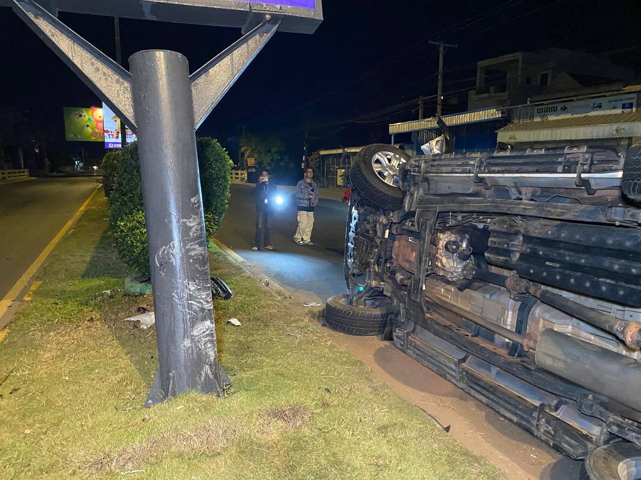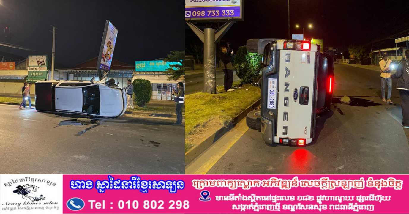 រថយន្តម៉ាកFORD RANGER មួយគ្រឿងបេីកឡើងសួនផ្លូវទៅបុកបង្គោលស្លាកប៉ាណូក្រឡាប់ផ្ងារជើង