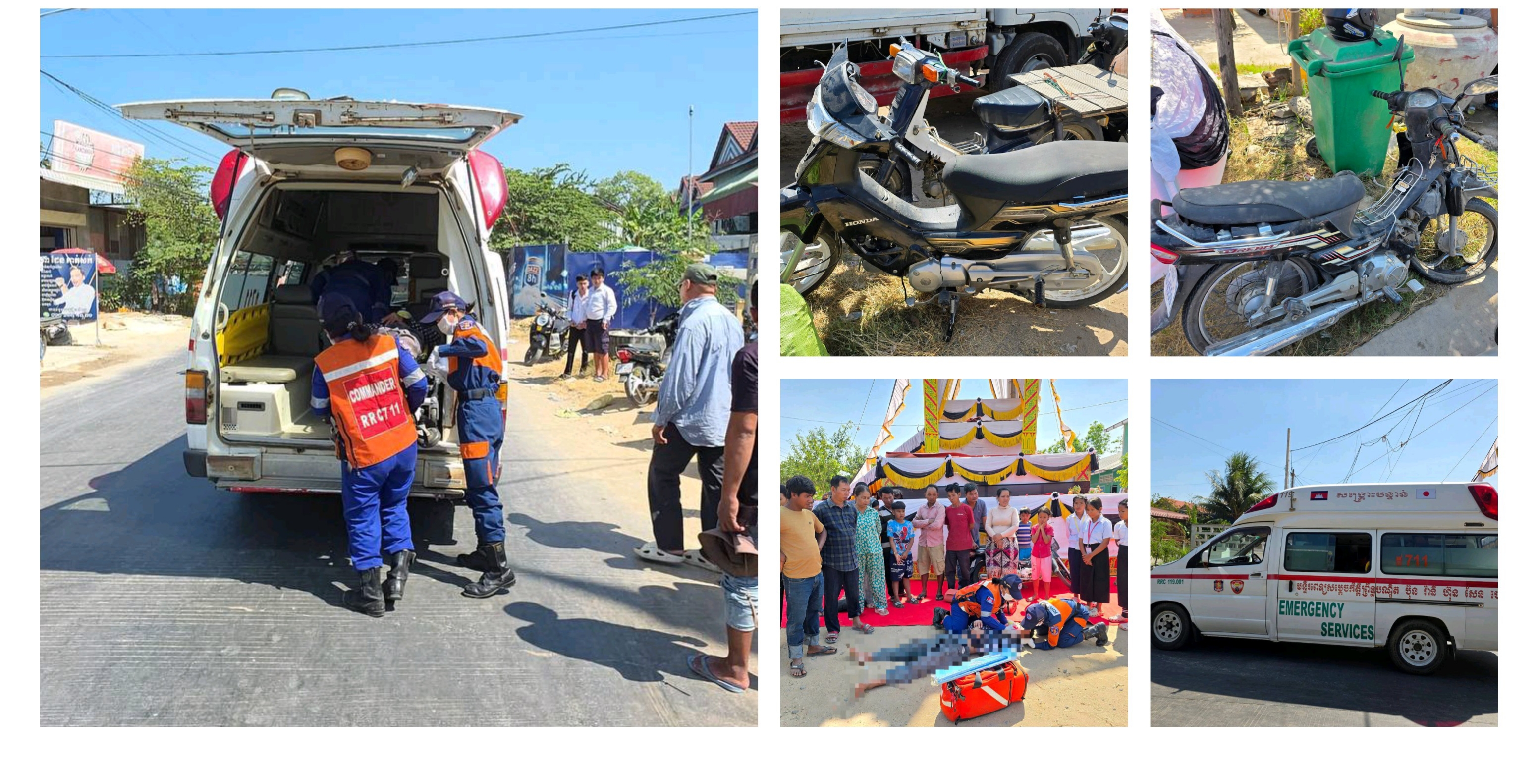 ក្រោយកេីតហេតុជនរងគ្រោះត្រូវបានរថយន្តសង្គ្រោះរបស់អង្គភាព៧១១ កងពលតូចលេខ៧០ ដឹកបញ្ជូនទៅមន្ទីពេទ្យព្រះកុសុមះ ដោយឡែកម៉ូតូត្រូវបានសមត្ថកិច្ចយកទៅរក្សាទុករងចាំដោះស្រាយពេលក្រោយ៕