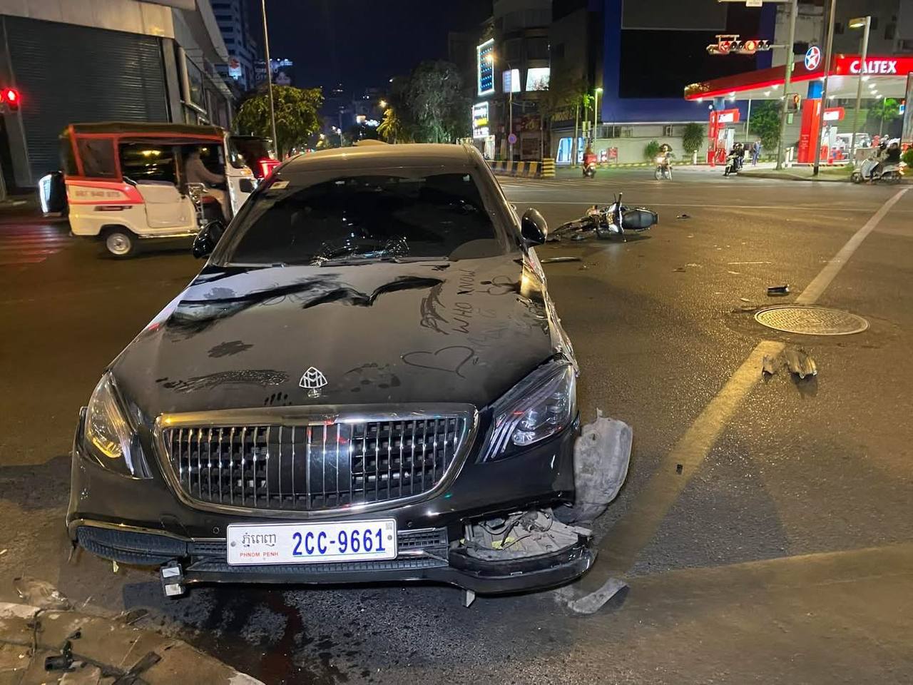 ប្រភពព័ត៌មានបានអោយដឹងថា មុនពេលកើតហេតុមានប្រពលរដ្ឋបានប្រាប់អោយដឹងថាយុវជន ពីរនាក់ ខណៈជិះ ម៉ូតូ HONDA Dream ពាក់ ផ្លាក លេខ ភ្នំពេញ 1IX-0304 ជិះ ឌុប គ្នា ក្នុង ល្បឿនលឿន ហេីយ បំពាន ភ្លើង សញ្ញា ចរាចរណ៍ ជ្រុល ទៅ បុករថយន្ដ Mercedes Maybach ពាក់ ផ្លាក លេខ ភ្នំពេញ 2CC-9661 ពេញទំហឹង ត្រង់ ចំណុច ផ្លូវ បំបែក ជា បួន (ស្តុប 42ជាន់) បណ្ដាលអោយរងរបួស ស្រាលធ្ងន់ ។