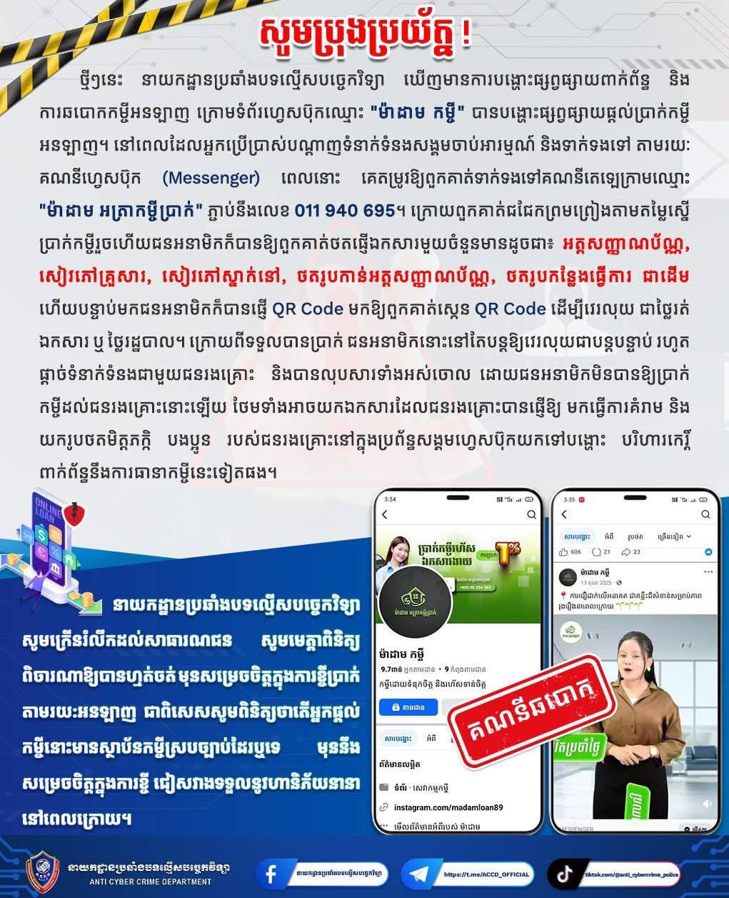 ភ្នំពេញ៖ នាយកដ្ឋាននគរបាលប្រឆាំងបទល្មើសបច្ចេកវិទ្យា នៅថ្ងៃទី១៤ ខែមករា ឆ្នាំ២០២៦នេះ បានឱ្យដឹងថា ថ្មីៗនេះ នាយកដ្ឋានប្រឆាំងបទល្មើសបច្ចេកវិទ្យា ឃើញមានការបង្ហោះផ្សព្វផ្សាយពាក់ព័ន្ធ និងការឆបោកកម្ចីអនទ្បាញ ក្រោមទំព័រហ្វេសប៊ុកឈ្មោះ “ម៉ាដាម កម្ចី” បានបង្ហោះផ្សព្វផ្សាយផ្តល់ប្រាក់កម្ចីអនឡាញ។