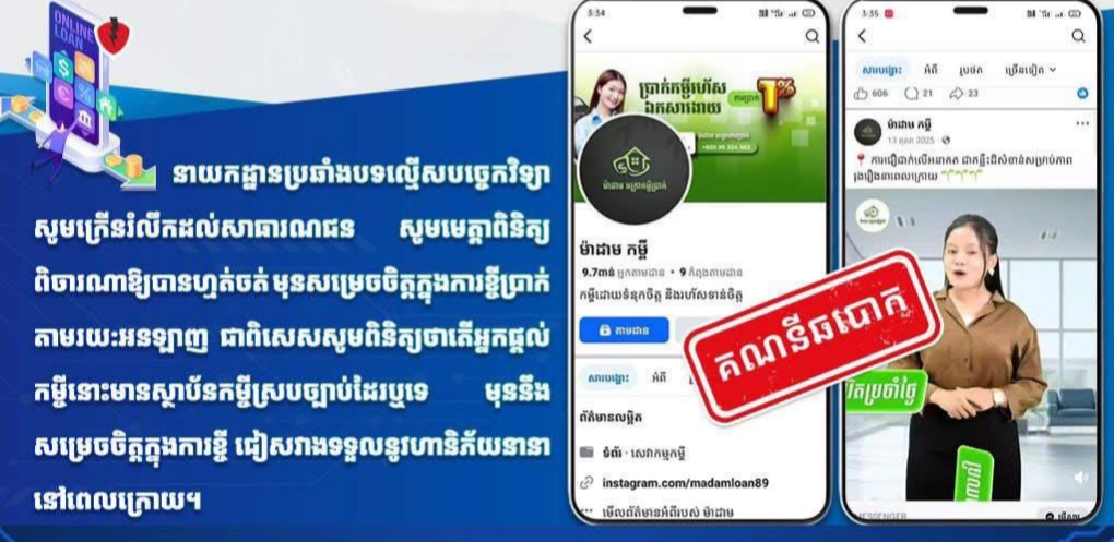 នាយកដ្ឋានប្រឆាំងបទល្មើសបច្ចេកវិទ្យា សូមក្រើនរំលឹកដល់សាធារណជន សូមមេត្តាពិនិត្យ ពិចារណាអោយបានហ្មត់ចត់ មុនសម្រេចចិត្តក្នុងការខ្ចីប្រាក់តាមរយ:អនឡាញ ជាពិសេសសូមពិនិត្យថាតើអ្នកផ្តល់កម្ចីនោះមានស្ថាប័នកម្ចីស្របច្បាប់ដែរឬទេ មុននឹងសម្រេចចិត្តក្នុងការខ្ចី ជៀសវាងទទួលនូវហនិភ័យនានានៅពេលក្រោយ៕