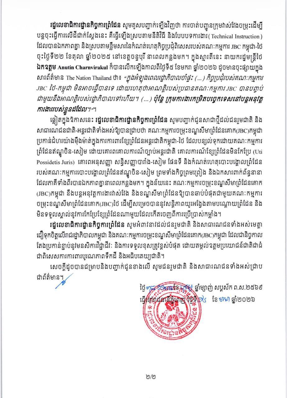 រដ្ឋលេខាធិការដ្ឋានកិច្ចការព្រំដែន សូមគូសបញ្ជាក់ឡើងវិញថា ការចាត់បញ្ជូនក្រុមវាស់វែងចម្រុះដើម្បី បន្តចុះធ្វើការលើដីជាក់ស្តែងនេះ គឺធ្វើឡើងស្របតាមនីតិវិធី និងបែបបទការងារ(Technical Instruction) ដែលបានឯកភាពគ្នា និងស្របតាមខ្លឹមសារនៃកំណត់ហេតុកិច្ចប្រជុំពិសេសរបស់គណៈកម្មការ JBC កម្ពុជា-ថៃ ចុះថ្ងៃទី២២ ខែតុលា ឆ្នាំ២០២៥ នៅខេត្តចន្ទបុរី នាពេលកន្លងមក។ ក្នុងស្មារតីនេះ នាយករដ្ឋមន្ត្រីថៃ ឯកឧត្តម Anutin Charnvirakul ក៏បានលើកឡើងកាលពីថ្ងៃទី៥ ខែមករា ឆ្នាំ២០២៦ ដូចមានចុះផ្សាយក្នុង សារព័ត៌មាន The Nation Thailand ថា៖ «ក្នុងអំឡុងពេលរដ្ឋាភិបាលចាំផ្ទះ (…) កិច្ចប្រជុំរបស់គណៈកម្មការ JBC ថៃ-កម្ពុជា មិនអាចធ្វើបានទេ ដោយហេតុថាអាណត្តិរបស់ប្រធានគណៈកម្មការ JBC បានបញ្ចប់ ជាមួយនឹងអាណត្តិរបស់រដ្ឋាភិបាលទៅហើយ។ (…) ប៉ុន្តែ ក្រុមការងារកម្រិតបច្ចេកទេសនៅបន្តអនុវត្ត ការងាររបស់ខ្លួនដដែល។»។