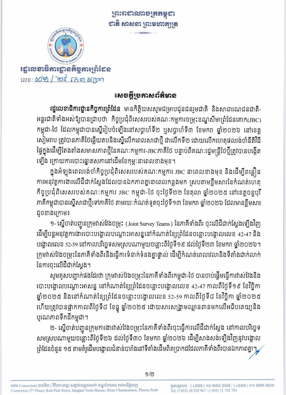 ក្នុងអំឡុងពេលរង់ចាំកិច្ចប្រជុំពិសេសរបស់គណៈកម្មការ JBC នាពេលខាងមុខ និងដើម្បីពន្លឿន ការអនុវត្តការងារលើដីជាក់ស្តែងដែលបានឯកភាពគ្នានាពេលកន្លងមក ស្របតាមខ្លឹមសារនៃកំណត់ហេតុ កិច្ចប្រជុំពិសេសរបស់គណៈកម្មការ JBC កម្ពុជា-ថៃ ចុះថ្ងៃទី២២ ខែតុលា ឆ្នាំ២០២៥ នៅខេត្តចន្ទបុរី ភាគីកម្ពុជាបានស្នើសាជាថ្មីទៅភាគីថៃ តាមរយៈកំណត់ទូតចុះថ្ងៃទី១៣ ខែមករា ឆ្នាំ២០២៦ ដែលមានខ្លឹមសារ ដូចខាងក្រោម៖