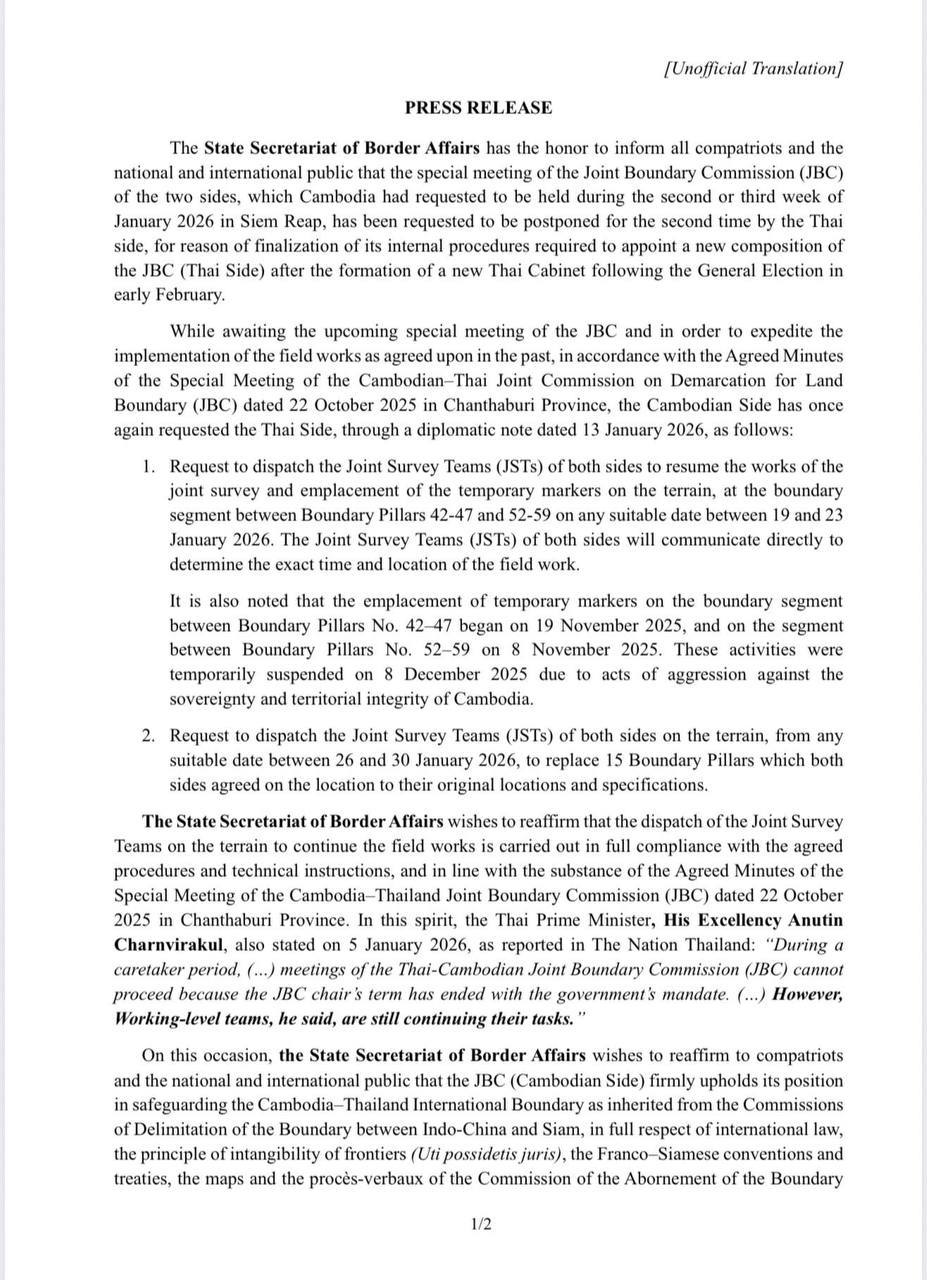 ភ្នំពេញ​៖​ រដ្ឋលេខាធិការដ្ឋានកិច្ចការព្រំដែន នៅថ្ងៃទី​១៤​ ខែមករា​ ឆ្នាំ​២០២៦នេះ​ មានកិត្តិយសសូមជម្រាបជូនជនរួមជាតិ និងសាធារណជនជាតិ- អន្តរជាតិទាំងអស់ឱ្យបានជ្រាបថា កិច្ចប្រជុំពិសេសរបស់គណៈកម្មការចម្រុះខណ្ឌសីមាព្រំដែនគោក (JBC) កម្ពុជា-ថៃ ដែលកម្ពុជាបានស្នើរៀបចំឡើងនៅសប្តាហ៍ទី២ ឬសប្តាហ៍ទី៣ ខែមករា ឆ្នាំ២០២៦ នៅខេត្ត សៀមរាប ត្រូវបានភាគីថៃឆ្លើយតបនិងស្នើលើកពេលសាជាថ្មី ជាលើកទី២ ដោយលើកហេតុផលរង់ចាំនីតិវិធី ផ្ទៃក្នុងដើម្បីតែងតាំងសមាសភាពថ្មីនៃគណៈកម្មការ-JBCភាគីថៃ បន្ទាប់ពីគណៈរដ្ឋមន្ត្រីថៃថ្មីត្រូវបានបង្កើត ឡើង ក្រោយការបោះឆ្នោតសភានៅដើមខែកុម្ភៈនាពេលខាងមុខ។