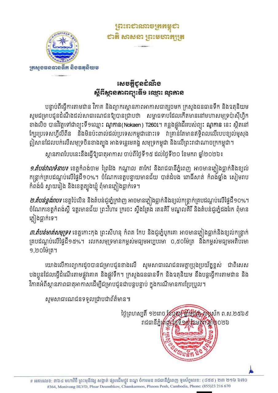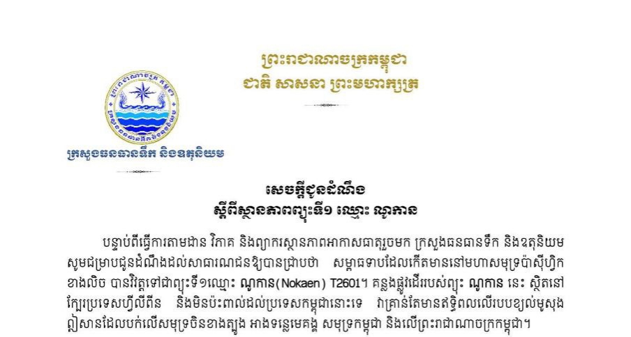 ភ្នំពេញ , បន្ទាប់ពីធ្វើការតាមដាន វិភាគ និងព្យាករស្ថានភាពអាកាសធាតុរួចមក ក្រសួងធនធានទឹក និងឧតុនិយម សូមជម្រាបជូនដំណឹងដល់សាធារណជនឱ្យបានជ្រាបថា សម្ពាធទាបដែលកើតមាននៅមហាសមុទ្រប៉ាស៊ីហ្វិក ខាងលិច បានវិវត្តទៅជាព្យុះទី១ឈ្មោះ ណូកាន (Nokaen) T2601។ គន្លងផ្លូវដើររបស់ព្យុះ ណូកាន នេះ ស្ថិតនៅ ក្បែរប្រទេសហ្វីលីពីន និងមិនប៉ះពាល់ដល់ប្រទេសកម្ពុជានោះទេ វាគ្រាន់តែមានឥទ្ធិពលលើរបបខ្យល់មូសុង ឦសានដែលបក់លើសមុទ្រចិនខាងត្បូង អាងទន្លេមេគង្គ សមុទ្រកម្ពុជា និងលើព្រះរាជាណាចក្រកម្ពុជា។