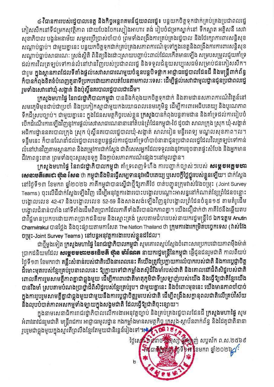 ក្រសួងមហាផ្ទៃ នៃរាជរដ្ឋាភិបាលកម្ពុជា គាំទ្រពេញទំហឹង ការបញ្ជាក់ច្បាស់ៗរបស់ សម្តេចអគ្គមហា សេនាបតីតេជោ ហ៊ុន សែន ថា កម្ពុជានឹងមិនធ្វើសម្បទាននូវអធិបតេយ្យ ឬសេចក្តីថ្លៃថ្នូររបស់ខ្លួនឡើយ។ ជាក់ស្តែង នៅថ្ងៃទី១៣ ខែមករា ឆ្នាំ២០២៦ ភាគីកម្ពុជាបានស្នើជាថ្មីឱ្យភាគីថៃ ចាត់បញ្ជូនក្រុមវាស់វែងចម្រុះ (Joint Survey Teams) ចុះលើដីជាក់ស្តែងឡើងវិញ ដើម្បីអនុវត្តការងារបោះបង្គោលបណ្តោះអាសន្ននៅកំណាត់ខ្សែព្រំដែនចន្លោះ បង្គោលលេខ 42-47 និងបង្គោលលេខ 52-59 និងសាងសង់ឡើងវិញនូវបង្គោលព្រំដែនចំនួន១៥ តាមគំរូដើម បង្គោលជំនាន់បារាំង នៅទីតាំងដើមពិតប្រាកដែលភាគីទាំងពីរបានឯកភាពគ្នា។ យើងជឿជាក់ថា ភាគីថៃនឹងឆ្លើយតប ជាវិជ្ជមានប្រកបដោយភាពប្រាកដនិយម និងស្មោះត្រង់ ស្របតាមជំហររបស់នាយករដ្ឋមន្ត្រីថៃ ឯកឧត្តម Anutin Charnvirakul បានថ្លែង និងចុះផ្សាយតាមកាសែត The Nation Thailand ថា ក្រុមការងារកម្រិតបច្ចេកទេស (វាស់វែង ចម្រុះ-Joint Survey Teams) នៅបន្តអនុវត្តការងាររបស់ខ្លួនដដែល។
