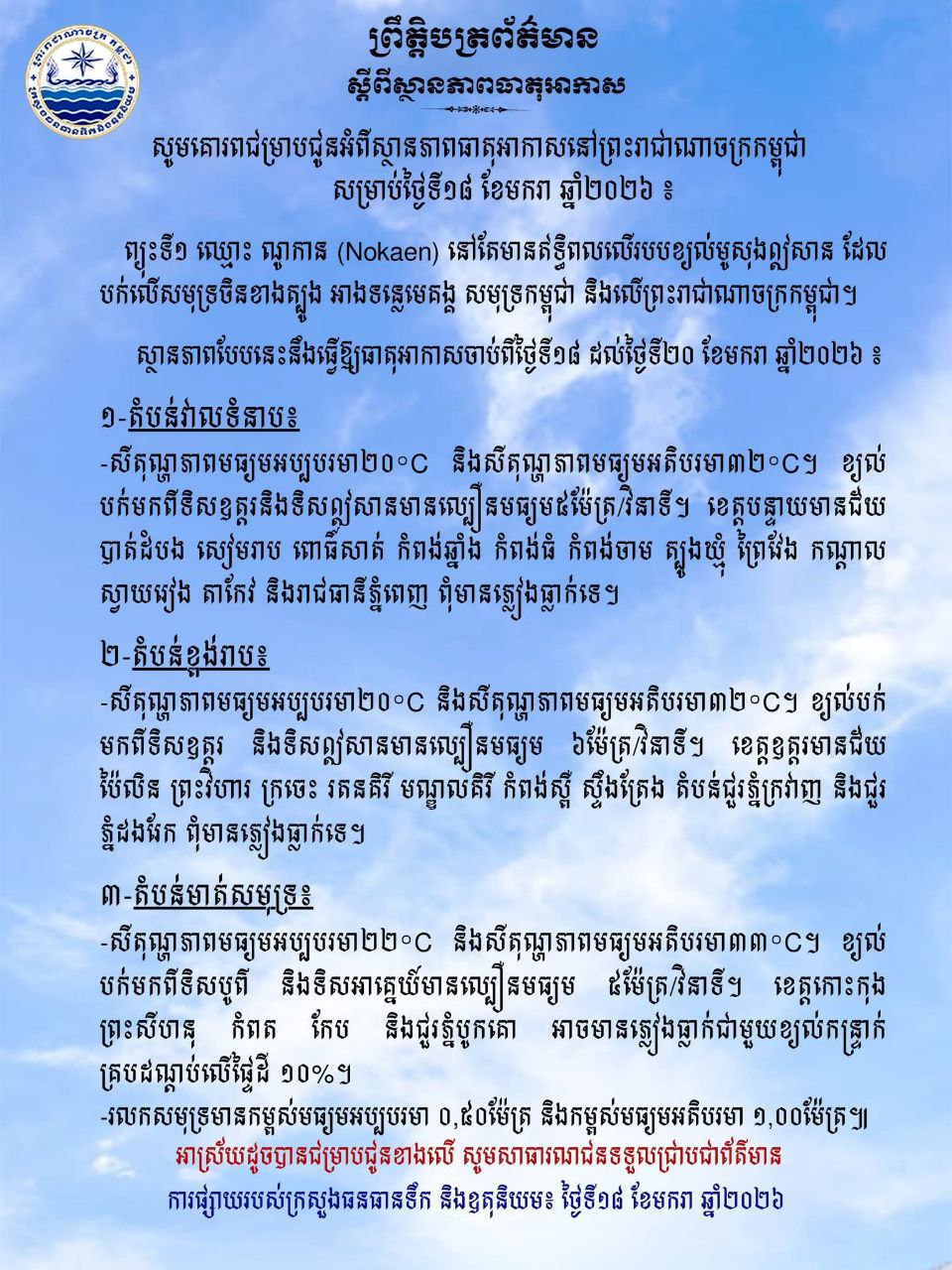ភ្នំពេញ : សូមគោរពជម្រាបជូនអំពីស្ថានភាពធាតុអាកាសនៅព្រះរាជាណាចក្រកម្ពុជា សម្រាប់ថ្ងៃទី១៨ ខែមករា ឆ្នាំ២០២៦ ៖ ព្យុះទី១ ឈ្មោះ ណូកាន (Nokaen) នៅតែមានឥទ្ធិពលលើរបបខ្យល់មូសុងឦសាន ដែល បក់លើសមុទ្រចិនខាងត្បូង អាងទន្លេមេគង្គ សមុទ្រកម្ពុជា និងលើព្រះរាជាណាចក្រកម្ពុជា។