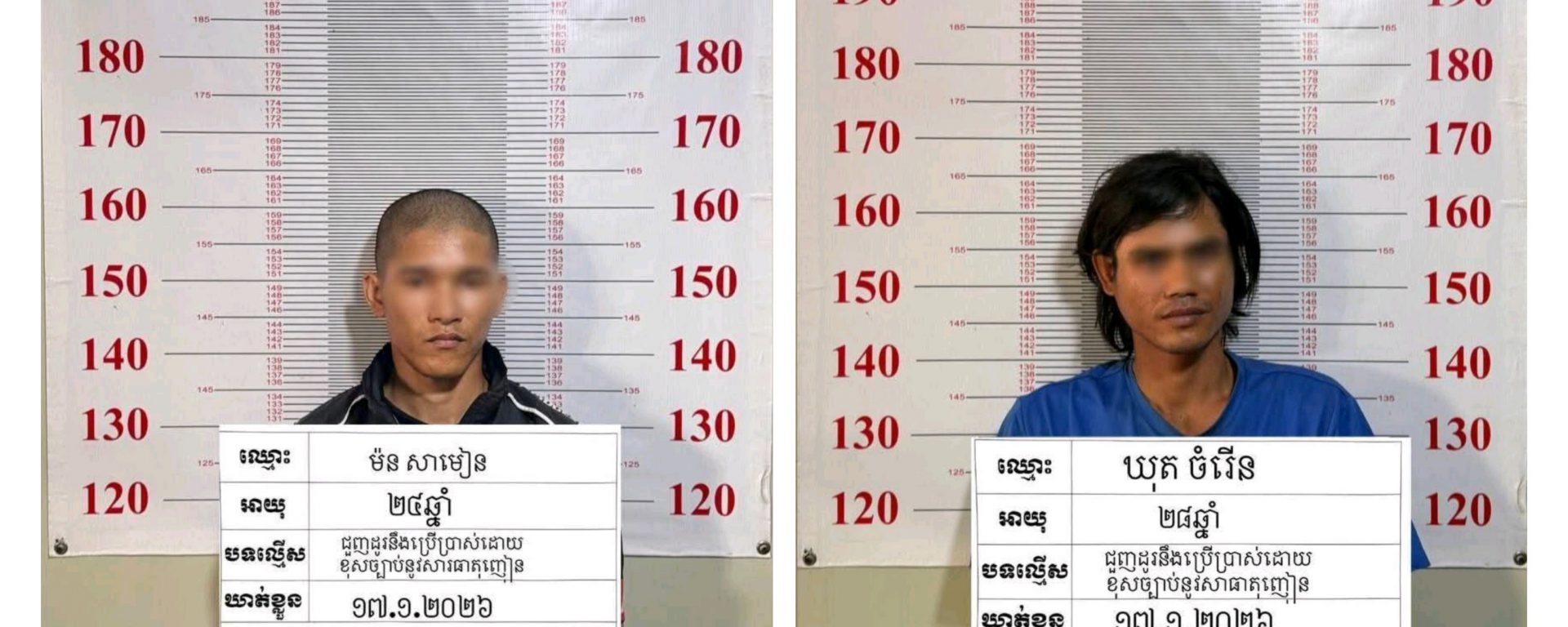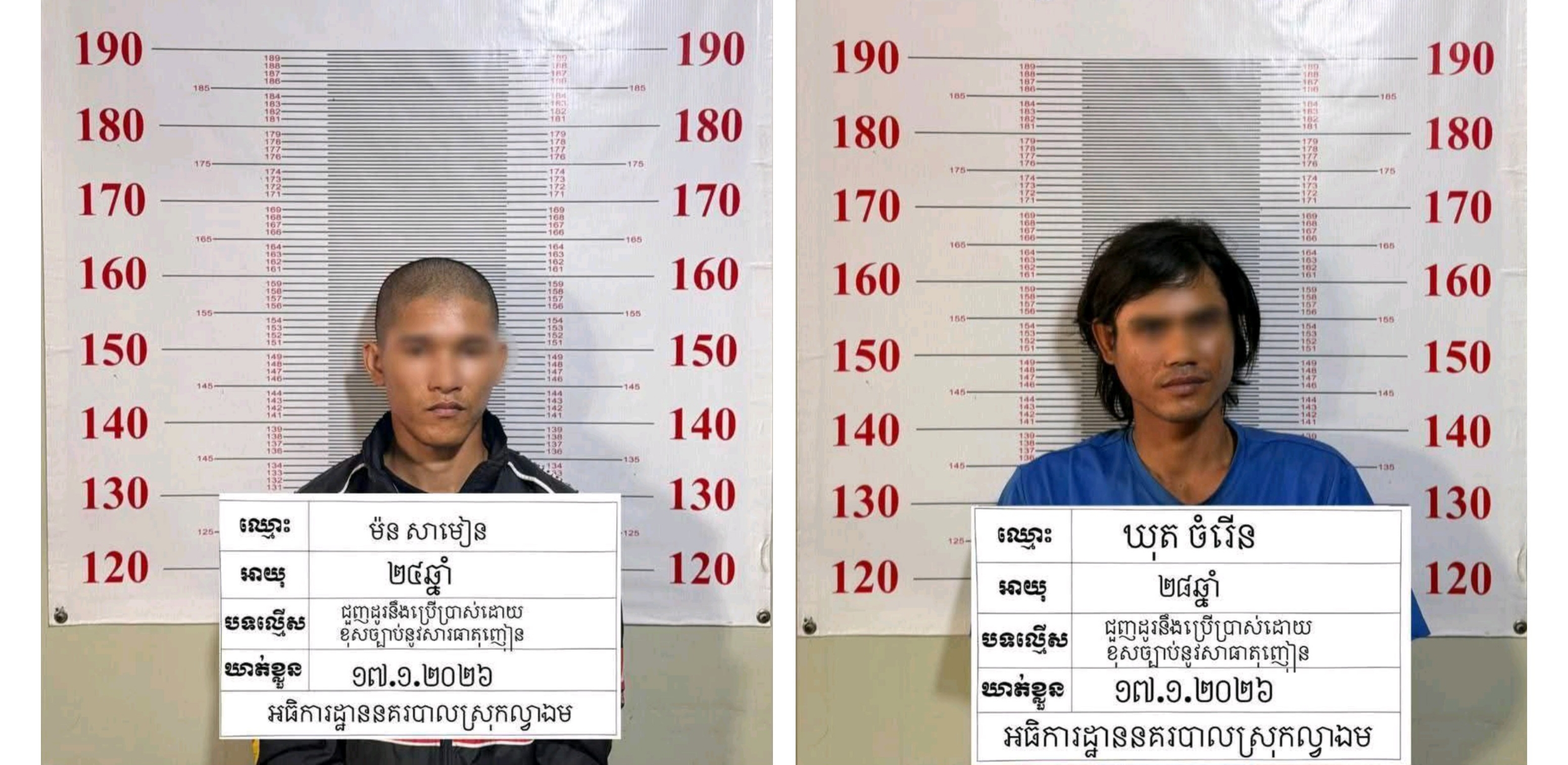 ខេត្តកណ្តាល ÷ ជនសង្ស័យ២នាក់ត្រូវសមត្ថកិច្ចឃាត់ ខ្លួនករណីប្រើប្រាស់និងជួញដូរដោយខុសច្បាប់សារធាតុញៀនជាមួយវត្ថុតាងគ្រឿងញៀន ចំនួន៦កញ្ចប់ទម្ងន់ ៣,៤ក្រាម កាលពីវេលាម៉ោង០៧និង០០នាទីថ្ងៃទី១៧ ខែមករា ឆ្នាំ ២០២៦ នៅចំណុចលើផ្លូវកៅស៊ូលេខ 70B ស្ថិតក្នុងភូមិបឹងគ្រំក្រោម ឃុំបឹងគ្រំ ស្រុកល្វាឯម ខេត្ត កណ្តាល ។