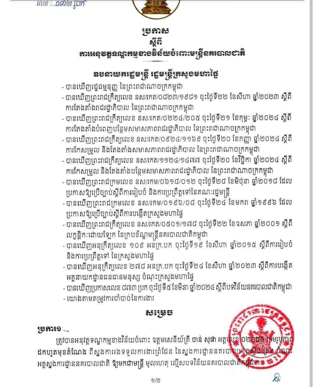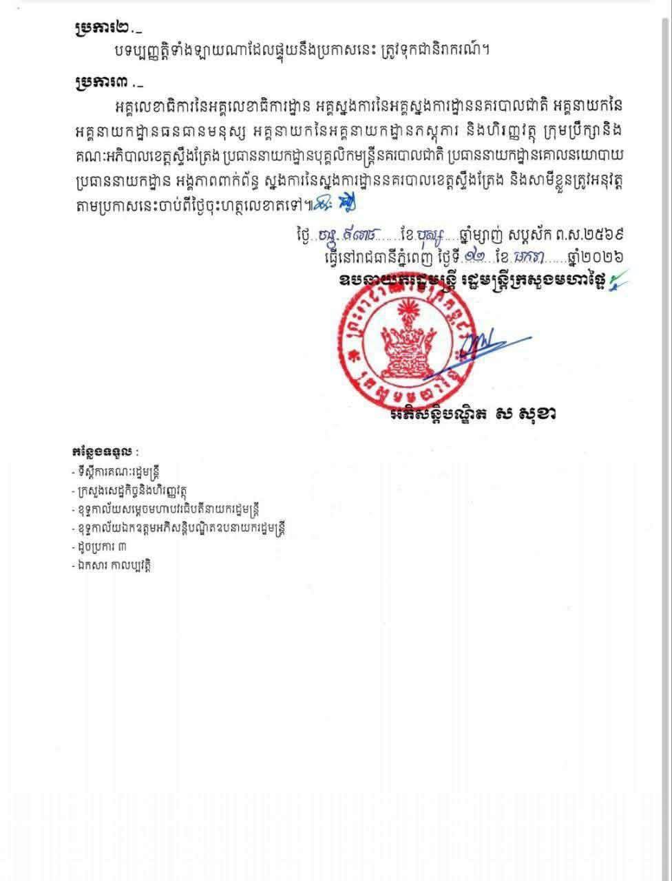 យោង តាម ប្រកាស ស្តី ពី ការ អនុវត្ត ទណ្ឌកម្ម ខាង វិន័យ ចំពោះ មន្ត្រី នគរបាល ជាតិ ចេញ កាលពី ថ្ងៃ ទី ១២ ខែមករា ឆ្នាំ ២០២៦ ត្រូវ បាន អនុវត្ត ទណ្ឌកម្ម ខាង វិន័យ ចំពោះ ឧត្តមសេនីយ៍ត្រី ចាន់ សុ ផា អត្តលេខ ០២០៤៦ តាម រូបភាព ដកហូត មុខ តំណែង ពី ស្នងការ រង ទទួល ការងារ ព្រំដែន នៃ ស្នងការដ្ឋាន នគរបាល ខេត្តស្ទឹងត្រែង ចំណុះ អគ្គស្នងការដ្ឋាន នគរបាល ជាតិ ឱ្យមក ជា មន្ត្រី ដោយ មូលហេតុ ល្មើស បទ វិន័យ នគរបាល ជាតិ កម្ម ជាតិ ។