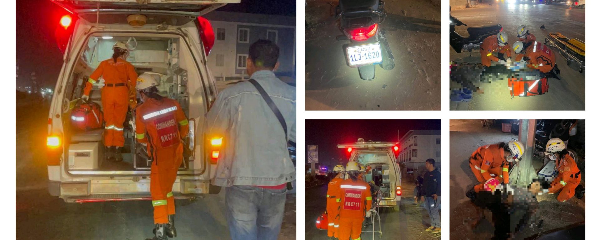 កងសង្គ្រោះបន្ទាន់៧១១កងពលតូចលេខ៧០ដឹកយកទៅមន្ទីរពេទ្យភ្លាមៗបន្ទាប់ពីជួបគ្រោះថ្នាក់ចរាចរណ៍ជិះម៉ូតូបុកជាមួយម៉ូតូសណ្តោងរ៉ឺម៉កកាលពីវេលាម៉ោង៧និង៤៦នាទីយប់ ថ្ងៃទី១៩ ខែមករា ឆ្នាំ២០២៦ នៅផ្លូវបេតុង ភូមិកប់ភ្លុក សង្កាត់ភ្លើងឆេះរទេះ ខណ្ឌកំបូល រាជធានីភ្នំពេញ ។