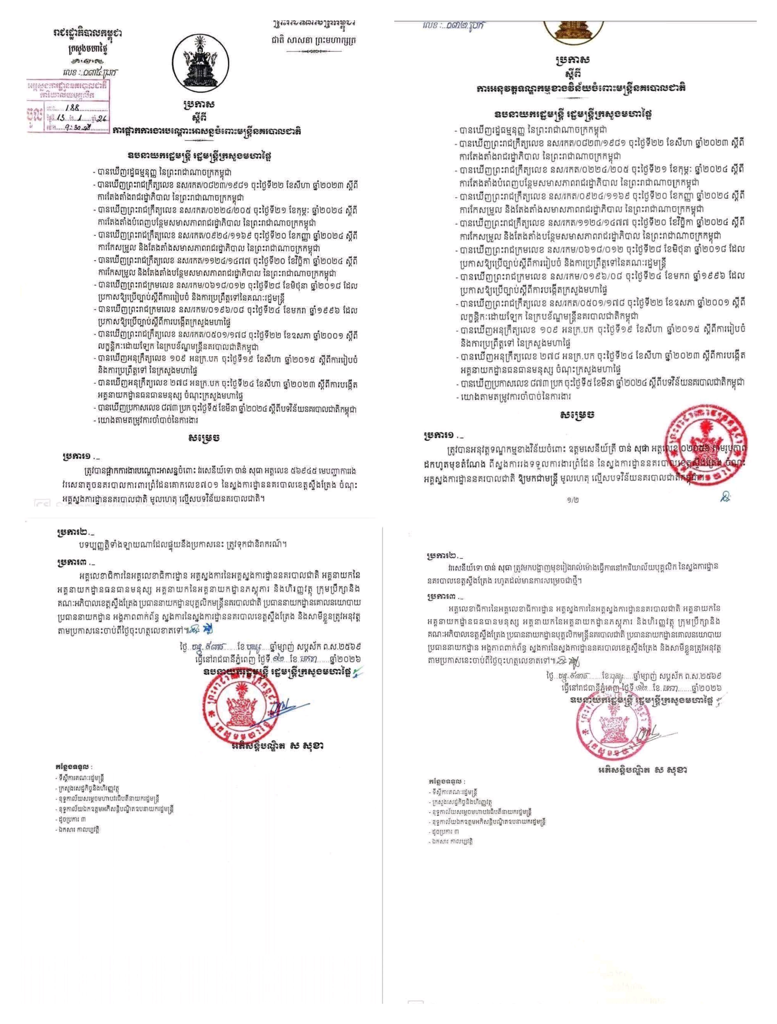 ២៖ វរសេនីយ៍ទោ ចាន់ សុធា អត្តលេខ៥៦៩៤៥ មេបញ្ជាការរង វរសេនាតូចនគរបាលការពារព្រំដែនគោកលេខ៧៩១ នៃស្នងការដ្ឋាននគរបាលខេត្តស្ទឹងត្រែង ត្រូវបានផ្អាកការងារបណ្តោះអាសន្ន។
