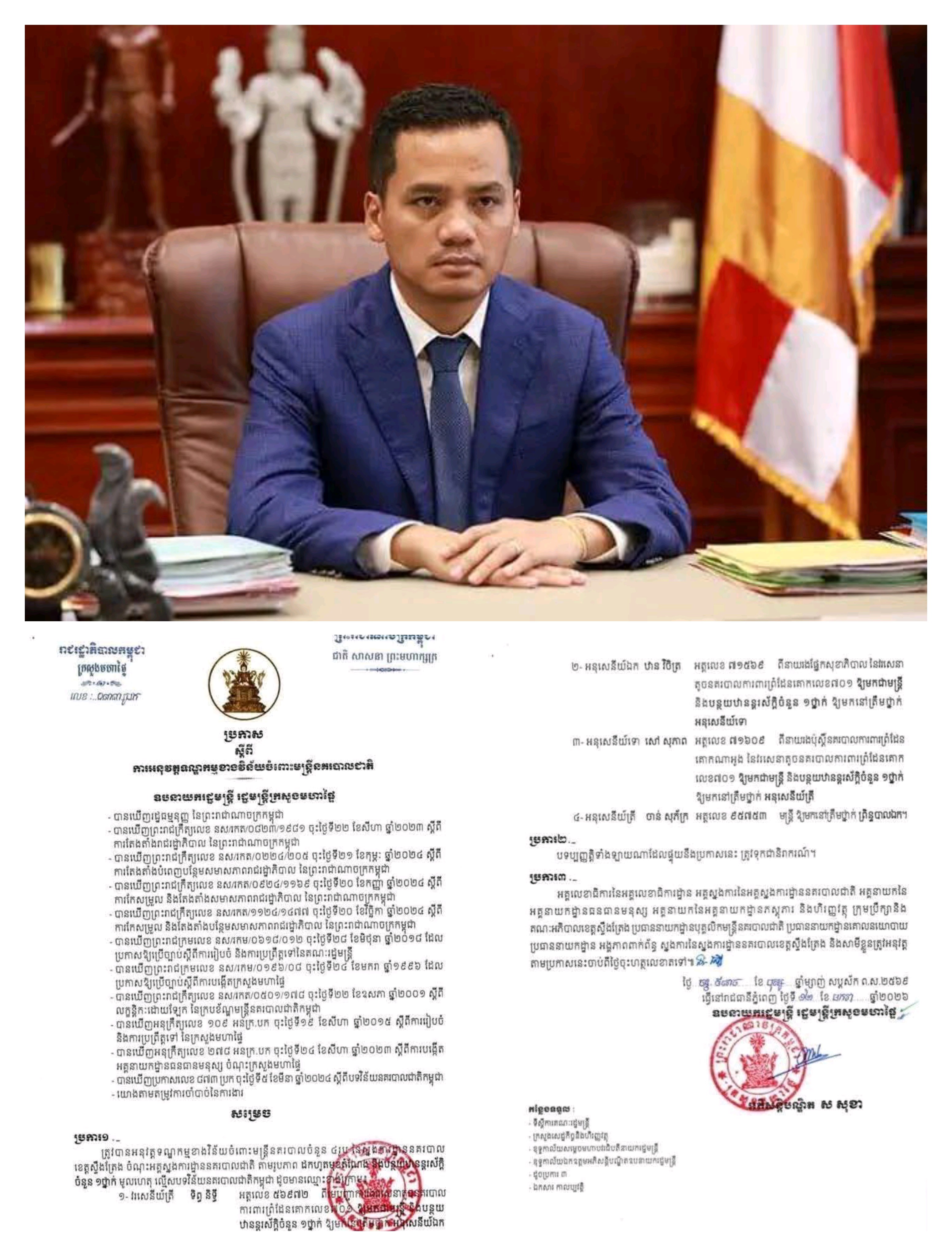 ភ្នំពេញ ៖ លោកឧបនាយករដ្ឋមន្ត្រី ស សុខា រដ្ឋមន្ត្រីក្រសួងមហាផ្ទៃ បានសម្រេចដកហូតមុខតំណែង និងបន្ថយឋានន្តរស័ក្តិ នគរបាលបាលខេត្តស្ទឹងត្រែង ចំនួន ៦រូប ក្នុងនោះមានម្នាក់ជាឧត្តមសេនីយ៍ត្រី (ផ្កាយ១) ផងដែរ ព្រោះប្រព្រឹត្តល្មើសវិន័យនគរបាល ពាក់ព័ន្ធហ្នឹង បទល្មើសនាំមនុស្សឆ្លងដែនខុសច្បាប់ ពីប្រទេសឡាវចូលមកកម្ពុជា ក្នុងនោះមានមេក្លោងជនជាតិឡាវចំនួន ៤នាក់ផងដែរ។