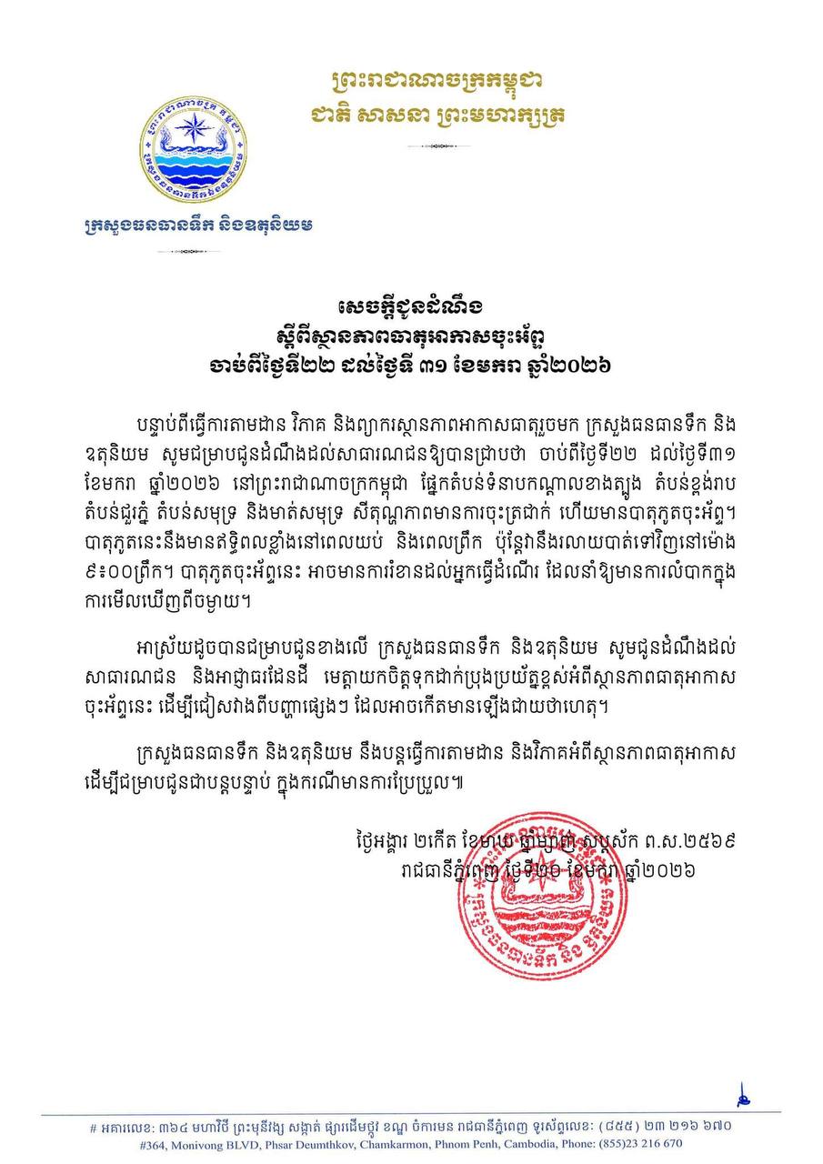បន្ទាប់ពីធ្វើការតាមដាន វិភាគ និងព្យាករស្ថានភាពអាកាសធាតុរួចមក ក្រសួងធនធានទឹក និង ឧតុនិយម សូមជម្រាបជូនដំណឹងដល់សាធារណជនឱ្យបានជ្រាបថា ចាប់ពីថ្ងៃទី២២ ដល់ថ្ងៃទី៣១ ខែមករា ឆ្នាំ២០២៦ នៅព្រះរាជាណាចក្រកម្ពុជា ផ្នែកតំបន់ទំនាបកណ្តាលខាងត្បូង តំបន់ខ្ពង់រាប តំបន់ជួរភ្នំ តំបន់សមុទ្រ និងមាត់សមុទ្រ សីតុណ្ហភាពមានការចុះត្រជាក់ ហើយមានបាតុភូតចុះអ័ព្ទ។ បាតុភូតនេះនឹងមានឥទ្ធិពលខ្លាំងនៅពេលយប់ និងពេលព្រឹក ប៉ុន្តែវានឹងរលាយបាត់ទៅវិញនៅម៉ោង ៩៖០០ព្រឹក។ បាតុភូតចុះអ័ព្ទនេះ អាចមានការរំខានដល់អ្នកធ្វើដំណើរ ដែលនាំឱ្យមានការលំបាកក្នុង ការមើលឃើញពីចម្ងាយ។