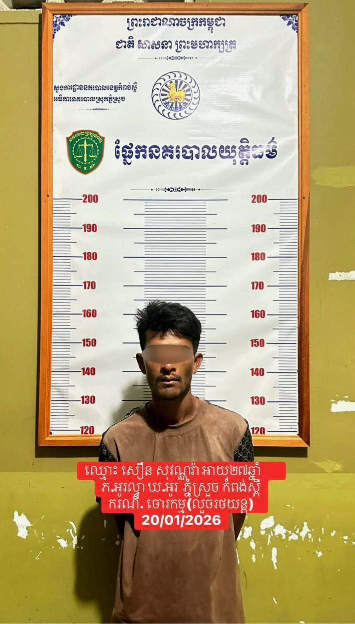 ការឃាត់ខ្លួនជនសង្ស័យលួចរថយន្តប្រជាពលរដ្ឋ កើតឡើងកាលពីព្រលប់ថ្ងៃទី២០ មករា ឆ្នាំ២០២៦ នៅម្តុំផ្សារត្រែងត្រយឹង ក្នុងភូមិផ្សារត្រែងត្រយឹង ឃុំត្រែងត្រយឹង ស្រុកភ្នំស្រួច ខេត្តកំពង់ស្ពឺ ។