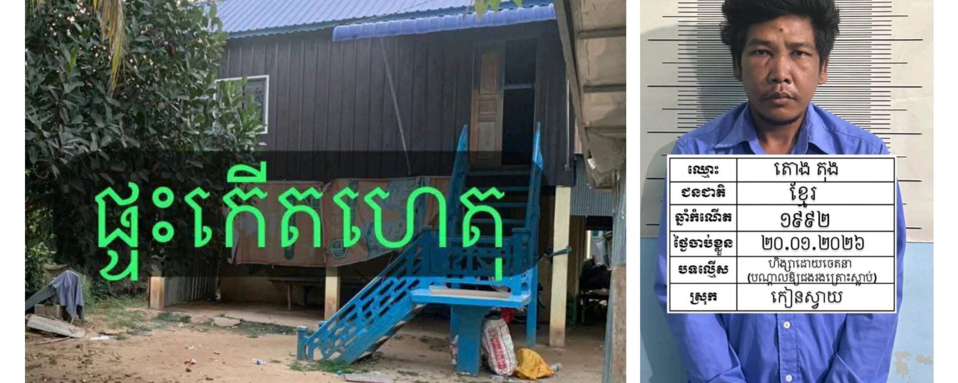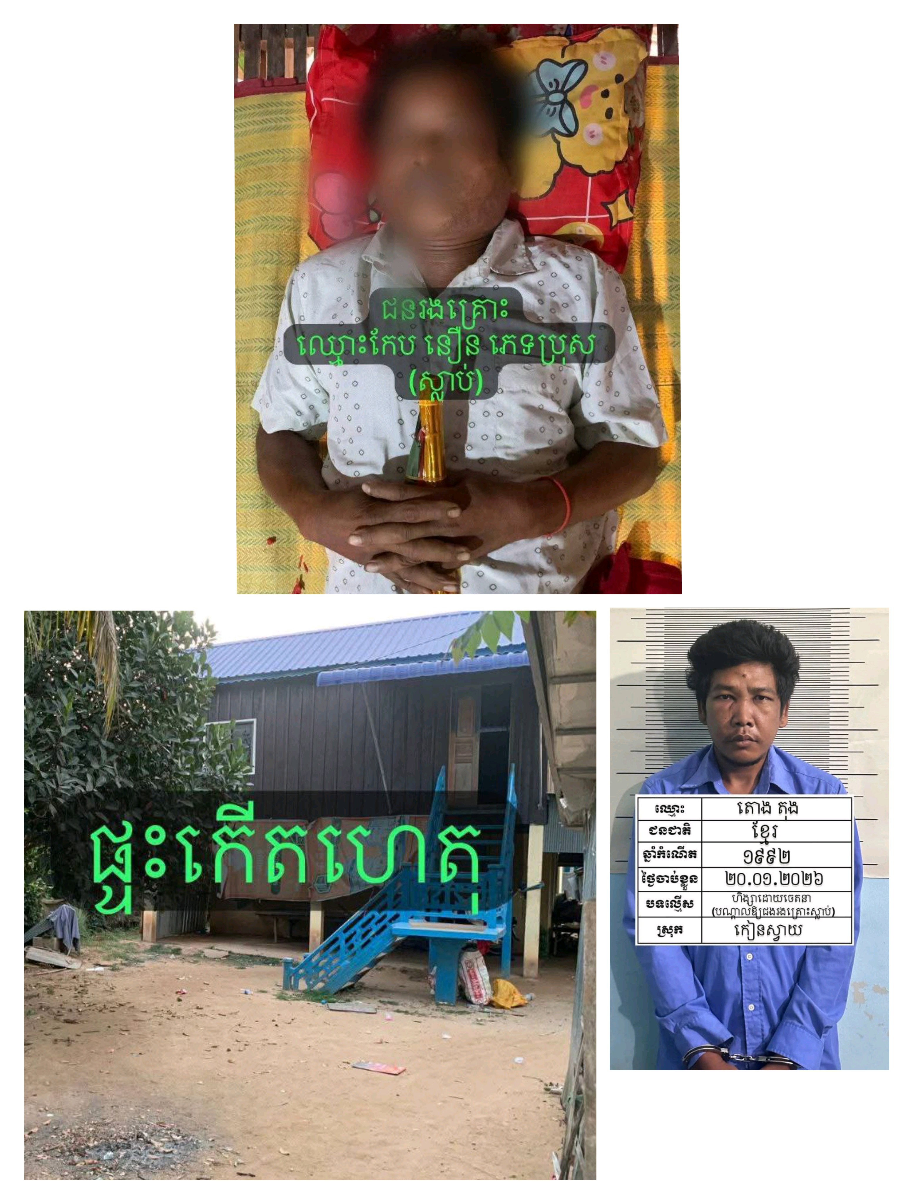 ជនរងគ្រោះឈ្មោះកែប នឿន ភេទប្រុស អាយុ៥៤ឆ្នាំជនជាតិខ្មែរ មុខរបរកសិករ មានទីលំនៅភូមិសំរោងក្អែរ ឃុំសំរោងធំស្រុកកៀនស្វាយ ខេត្តកណ្តាល(ស្លាប់)។ ដោយឡែកជនសង្ស័យឈ្មោះ តោង តុង ភេទប្រុសអាយុ៣៥ឆ្នាំ ជនជាតិខ្មែរមុខរបរមិនពិតមានទីលំនៅភូមិសំរោងក្អែរ ឃុំសំរោងធំ ស្រុកកៀនស្វាយ ខេត្ត កណ្តាលត្រូវបានសមត្ថកិច្ចឃាត់ខ្លួន។ តេស្តទឹកនោមរកសារធាតុញៀន (-)អវិជ្ជមាន។