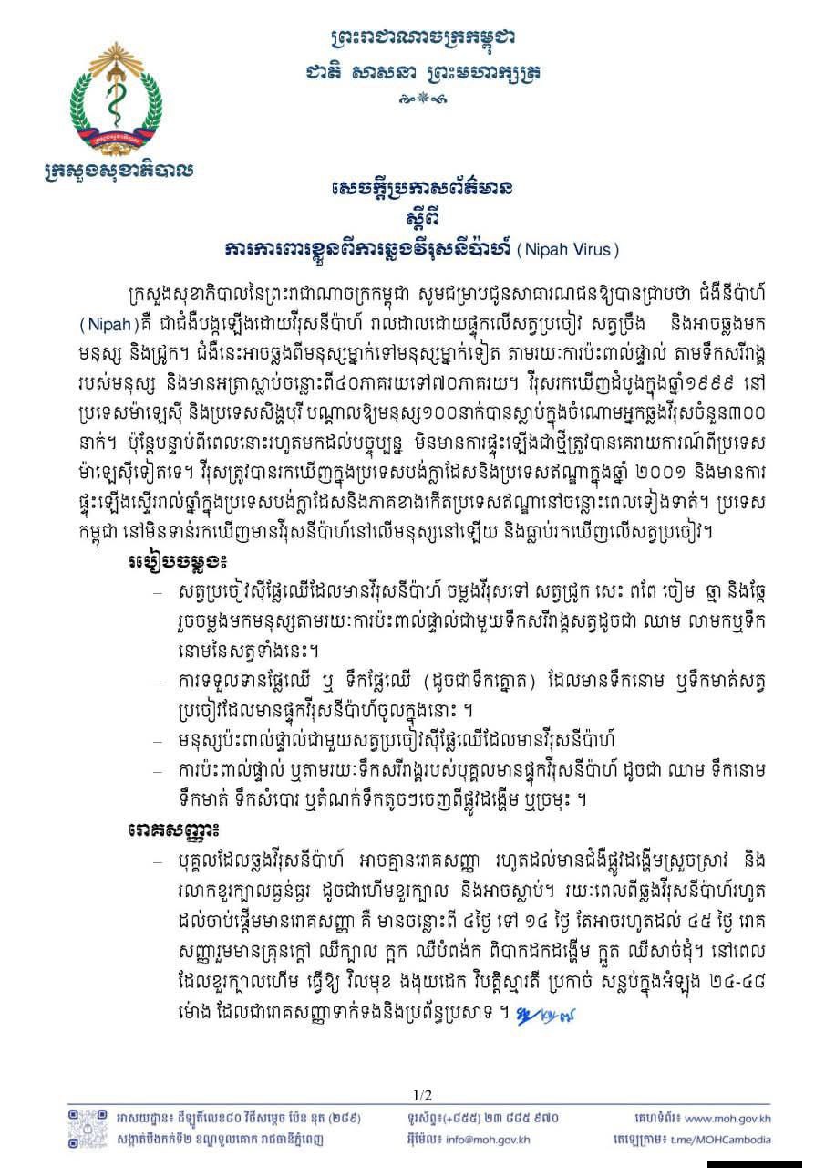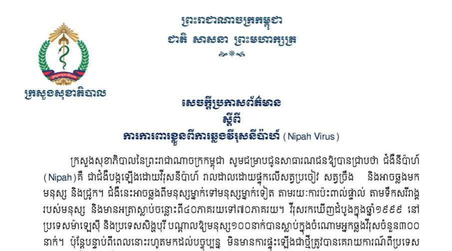 ភ្នំពេញ៖ ក្រសួងសុខាភិបាលនៃព្រះរាជាណាចក្រកម្ពុជា សូមជម្រាបជូនសាធារណជនឱ្យបានជ្រាបថា ជំងឺនីប៉ាហ៍ (Nipah)គឺ ជាជំងឺបង្កឡើងដោយវីរុសនីប៉ាហ៍ រាលដាលដោយផ្ទុកលើសត្វប្រចៀវ សត្វប្រឹង និងអាចឆ្លងមក មនុស្ស និងជ្រូក។ ជំងឺនេះអាចឆ្លងពីមនុស្សម្នាក់ទៅមនុស្សម្នាក់ទៀត តាមរយៈការប៉ះពាល់ផ្ទាល់ តាមទឹកសរីរាង្គ របស់មនុស្ស និងមានអត្រាស្លាប់ចន្លោះពី៤០ភាគរយទៅ៧០ភាគរយ។ វីរុសរកឃើញដំបូងក្នុងឆ្នាំ១៩៩៩ នៅ ប្រទេសម៉ាឡេស៊ី និងប្រទេសសិង្ហបុរី បណ្តាលឱ្យមនុស្ស១០០នាក់បានស្លាប់ក្នុងចំណោមអ្នកឆ្លងវីរុសចំនួន៣០០ នាក់។ ប៉ុន្តែបន្ទាប់ពីពេលនោះរហូតមកដល់បច្ចុប្បន្ន មិនមានការផ្ទុះឡើងជាថ្មីត្រូវបានគេរាយការណ៍ពីប្រទេស ម៉ាឡេស៊ីទៀតទេ។ វីរុសត្រូវបានរកឃើញក្នុងប្រទេសបង់ក្លាដែសនិងប្រទេសឥណ្ឌាក្នុងឆ្នាំ ២០០១ និងមានការ ផ្ទុះឡើងស្ទើររាល់ឆ្នាំក្នុងប្រទេសបង់ក្លាដែសនិងភាគខាងកើតប្រទេសឥណ្ឌានៅចន្លោះពេលទៀងទាត់។ ប្រទេស កម្ពុជា នៅមិនទាន់រកឃើញមានវីរុសនីប៉ាហ៍នៅលើមនុស្សនៅឡើយ និងធ្លាប់រកឃើញលើសត្វប្រចៀវ។