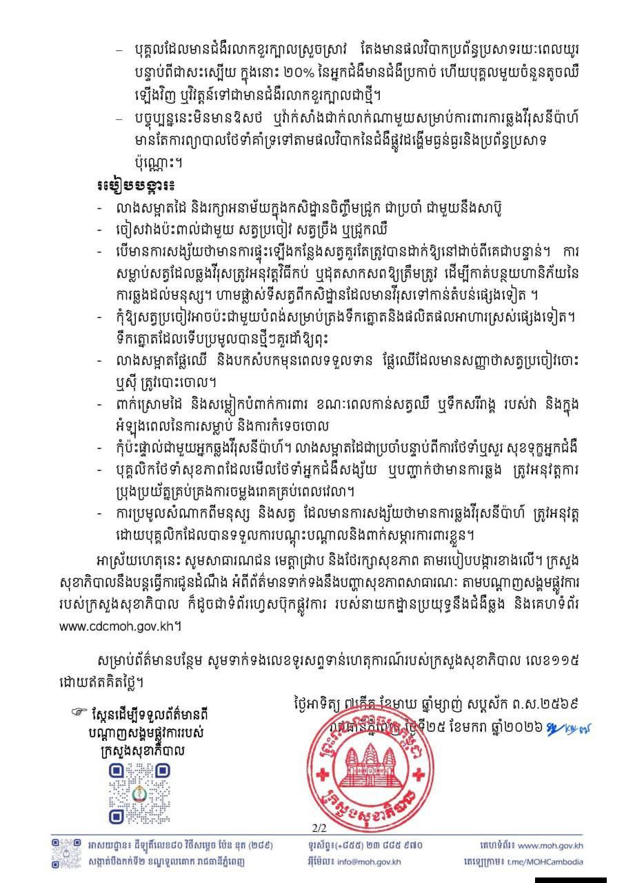 អាស្រ័យហេតុនេះ សូមសាធារណជន មេត្តាជ្រាប និងថែរក្សាសុខភាព តាមរបៀបបង្ការខាងលើ។ ក្រសួង សុខាភិបាលនឹងបន្តធ្វើការជូនដំណឹង អំពីព័ត៌មានទាក់ទងនឹងបញ្ហាសុខភាពសាធារណៈ តាមបណ្តាញសង្គមផ្លូវការ របស់ក្រសួងសុខាភិបាល ក៏ដូចជាទំព័រហ្វេសប៊ុកផ្លូវការ របស់នាយកដ្ឋានប្រយុទ្ធនឹងជំងឺឆ្លង និងគេហទំព័រ www.cdcmoh.gov.kh។