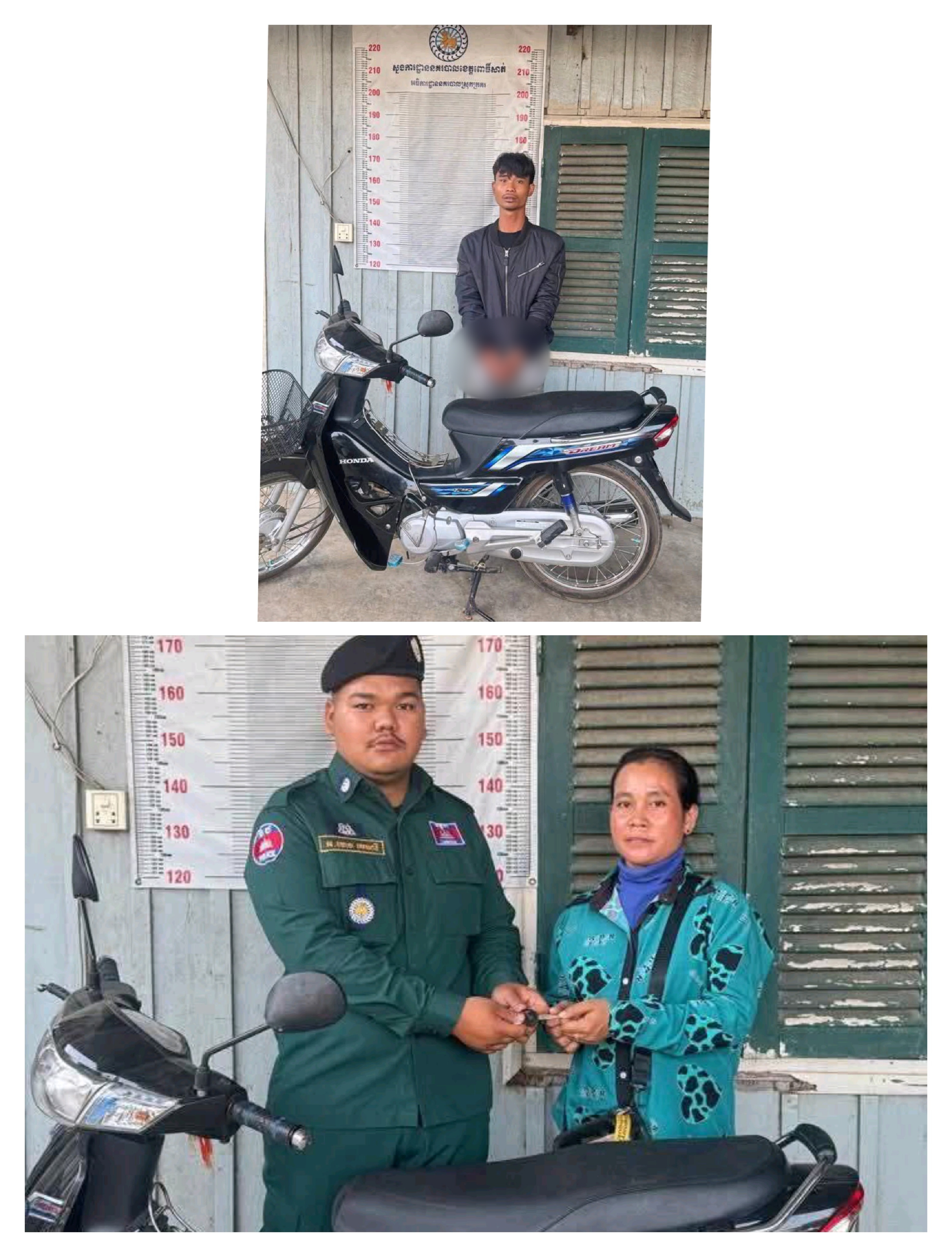 ក្រោមកិច្ចអន្តរាគមន៍របស់សមត្ថកិច្ចតាមដងផ្លូវក៏ឃាត់ ខ្លួន ជនសង្ស័យឈ្មោះ ជា រស្មី ភេទប្រុស អាយុ២៦ឆ្នាំ មុខរបរមិនពិតប្រាកដ ជនជាតិខ្មែរ ស្រុកកំណើតភូមិទួលលាន ឃុំជ័យកំពក ស្រុកព្រះស្ដេចខេត្តព្រៃវែង និងវត្ថុតាងដកហូត ម៉ូតូម៉ាកC125 ពណ៌ខ្មៅ ផលិតឆ្នាំ 2016 ស្លាកលេខពោធិ៍សាត់1G-5422 មួកសុវត្ថិភាពពណ៌ខ្មៅចំនួន១។ ក្រោយធ្វើការបង្រ្កាបរួចសមត្ថកិច្ចបានប្រគល់វត្ថុតាងជូនជនរងគ្រោះវិញ។