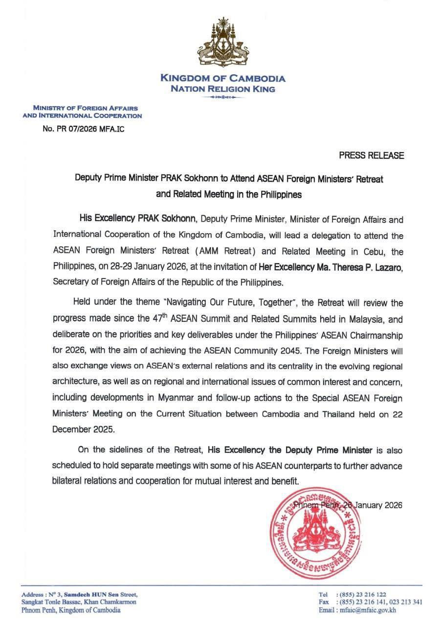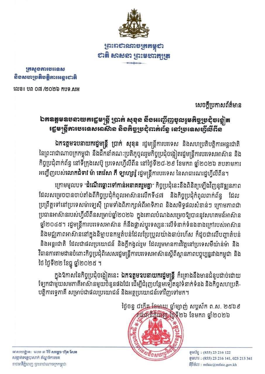 ភ្នំពេញ៖ លោកឧបនាយករដ្ឋមន្ត្រី ប្រាក់ សុខុន រដ្ឋមន្ត្រីការបរទេស និងសហប្រតិបត្តិការអន្តរជាតិ នៃព្រះរាជាណាចក្រកម្ពុជា នឹងដឹកនាំគណៈប្រតិភូចូលរួមកិច្ចប្រជុំចង្អៀតរដ្ឋមន្ត្រីការបរទេសអាស៊ាន និង កិច្ចប្រជុំពាក់ព័ន្ធ នៅទីក្រុងសេប៊ូ ប្រទេសហ្វីលីពីន នៅថ្ងៃទី២៨-២៩ ខែមករា ឆ្នាំ២០២៦ តបតាមការ អញ្ជើញរបស់លោកជំទាវ ម៉ា តេរ៉េសា ភី ឡាហ្សារ៉ូ រដ្ឋមន្ត្រីការបរទេស នៃសាធារណរដ្ឋហ្វីលីពីន។