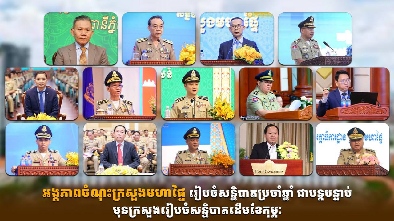 ភ្នំពេញ៖ គិតត្រឹមថ្ងៃទី២៧ ខែមករា ឆ្នាំ២០២៦ មានអគ្គនាយកដ្ឋាន និងអង្គភាពចំណុះក្រសួងមហាផ្ទៃចំនួន១៣ហើយ បានរៀបចំសន្និបាតបូកសរុបលទ្ធផលការងារប្រចាំឆ្នាំ២០២៥ និងលើកទិសដៅការងារឆ្នាំ២០២៦។ សន្និបាតនេះត្រូវបានរៀបចំជាបន្តបន្ទាប់ នៅទីស្ដីការក្រសួងមហាផ្ទៃ មុនឈានទៅដល់សន្និបាតក្រសួងដែលគ្រោងធ្វើឡើងនាពេលខាងមុខនេះ។