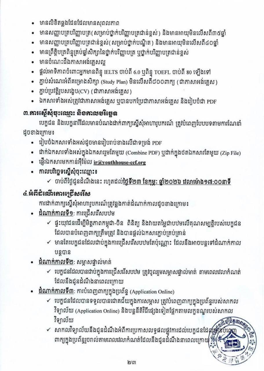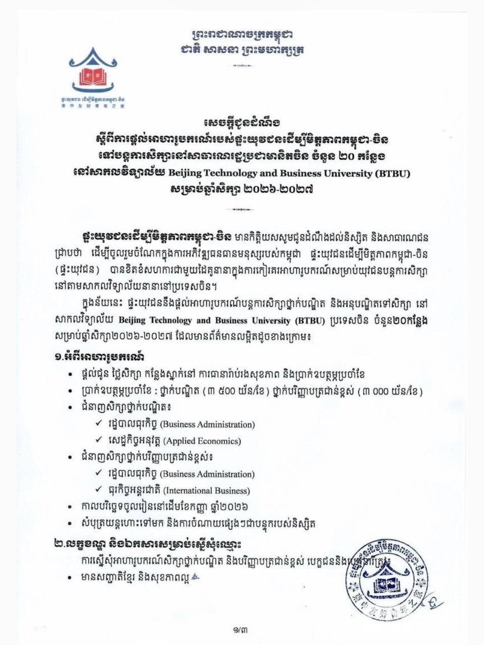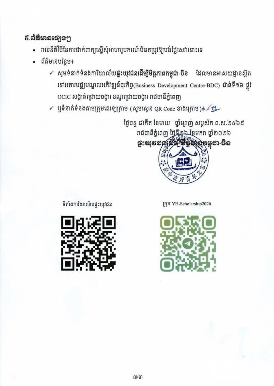 ភ្នំពេញ៖ ផ្ទះយុវជនដើម្បីមិត្តភាពកម្ពុជា-ចិន ផ្តល់អាហារូបករណ៍ពេញថ្លៃ ថ្នាក់បណ្ឌិត និងអនុបណ្ឌិត ចំនួន២០កន្លែងទៅសិក្សានៅសាកលវិទ្យាល័យ Beijing Technology and Business University ប្រទេសចិនសម្រាប់ឆ្នាំសិក្សា ២០២៦-២០២៧។
