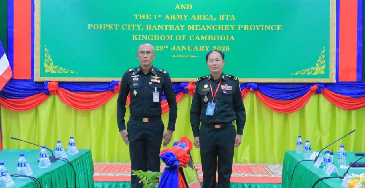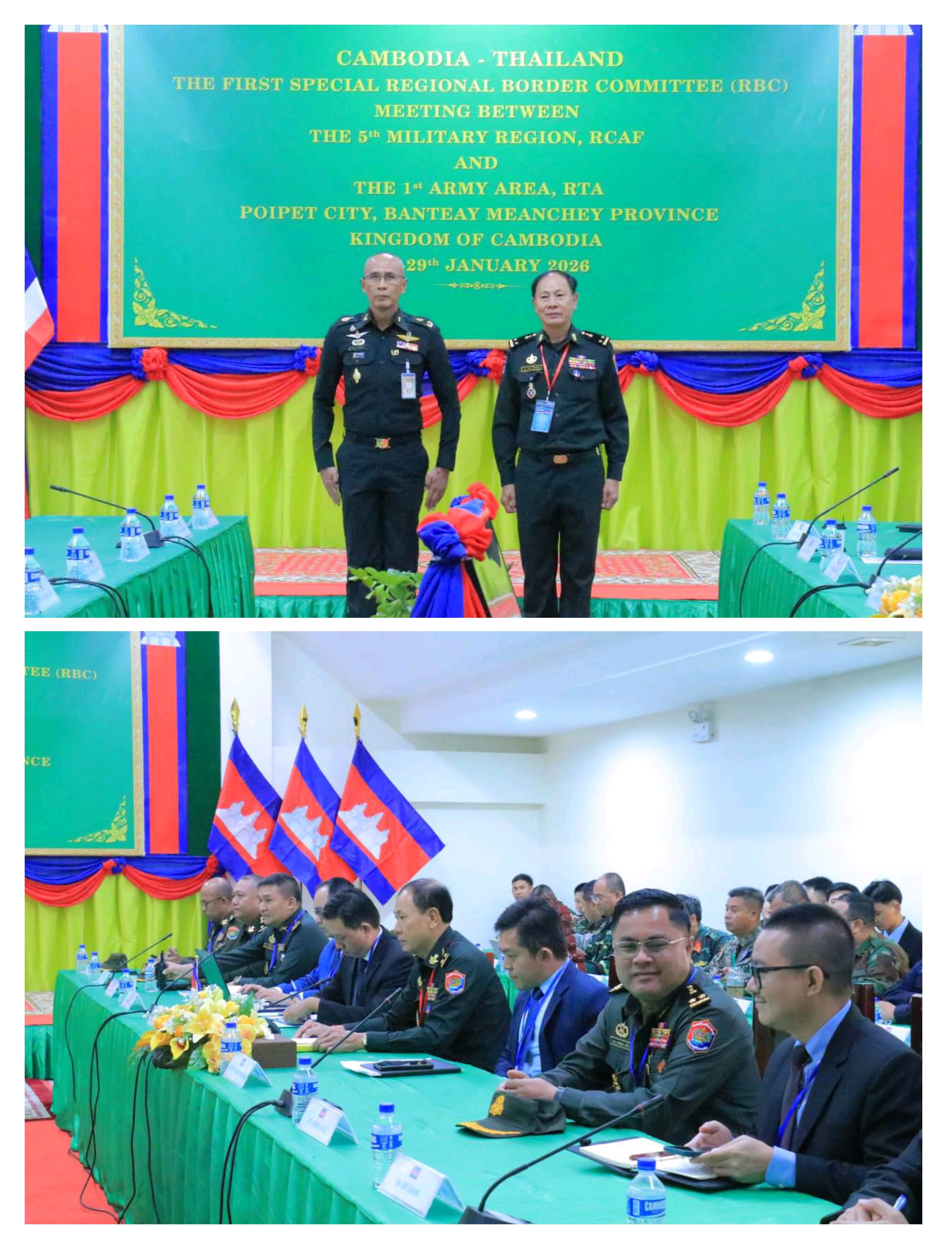នៅថ្ងៃទី២៩ ខែមករា ឆ្នាំ២០២៦ វេលាម៉ោង ៩:០០នាទីព្រឹកនេះ កិច្ចប្រជុំក្រុមលេខាធិការដ្ឋាននៃគណៈកម្មាធិការព្រំដែនថ្នាក់យោធភូមិភាគកម្ពុជា-ថៃ (RBC) រវាងយោធភូមិភាគទី៥ ភាគីកម្ពុជា និងកងទ័ពភូមិភាគទី១ ភាគីថៃ បានបញ្ចប់កិច្ចប្រជុំពិភាក្សារបស់ខ្លួនហើយ បន្ទាប់ពីដំណើរការអស់រយៈពេលបីថ្ងៃគឺ ចាប់ពីថ្ងៃទី២៧ ដល់ថ្ងៃទី២៩ ខែមករា ឆ្នាំ២០២៦ ដែលបានប្រព្រឹត្តទៅនៅច្រកអន្តរជាតិប៉ោយប៉ែត ខេត្តបន្ទាយមានជ័យ ព្រះរាជាណាចក្រកម្ពុជា ទល់នឹងខេត្តស្រះកែវ ព្រះរាជាណាចក្រថៃ។ គណៈប្រតិភូក្រុមលេខាធិការរបស់កម្ពុជាដឹកនាំដោយ ឧត្តមសេនីយ៍ទោ សរ គឹមប៉ាក់ ប្រធានក្រុមលេខាធិការ (RBC) កម្ពុជា និងគណៈប្រតិភូក្រុមលេខាធិការរបស់ថៃដឹកនាំដោយ ឧត្តមសេនីយ៍ទោ ភិថាយ៉ាគូល ពោធិ៍សុវណ្ណ ប្រធានក្រុមលេខាធិការ (RBC ) ថៃ។