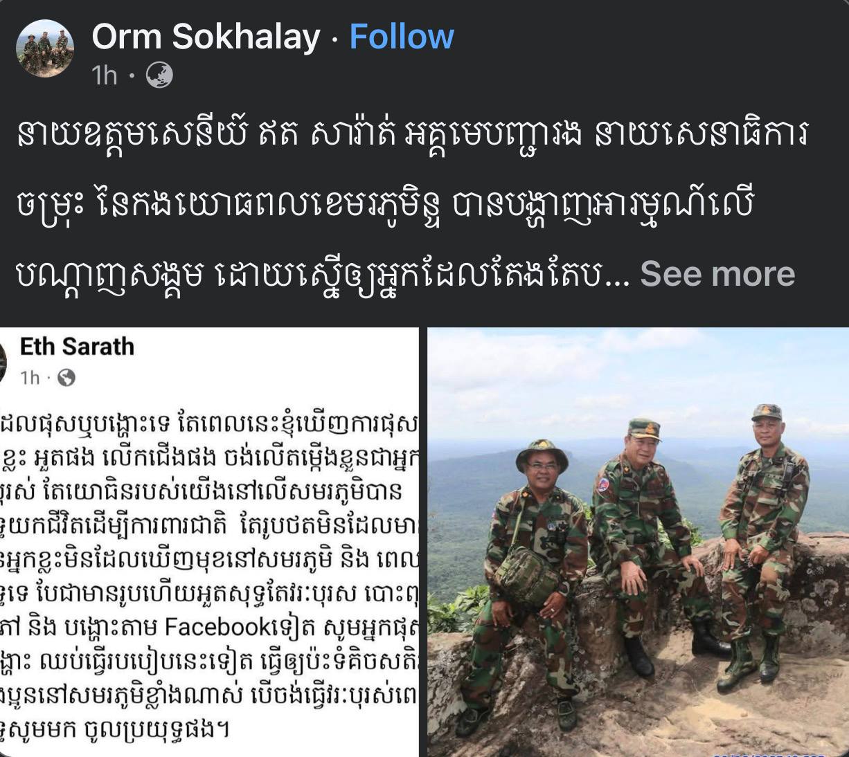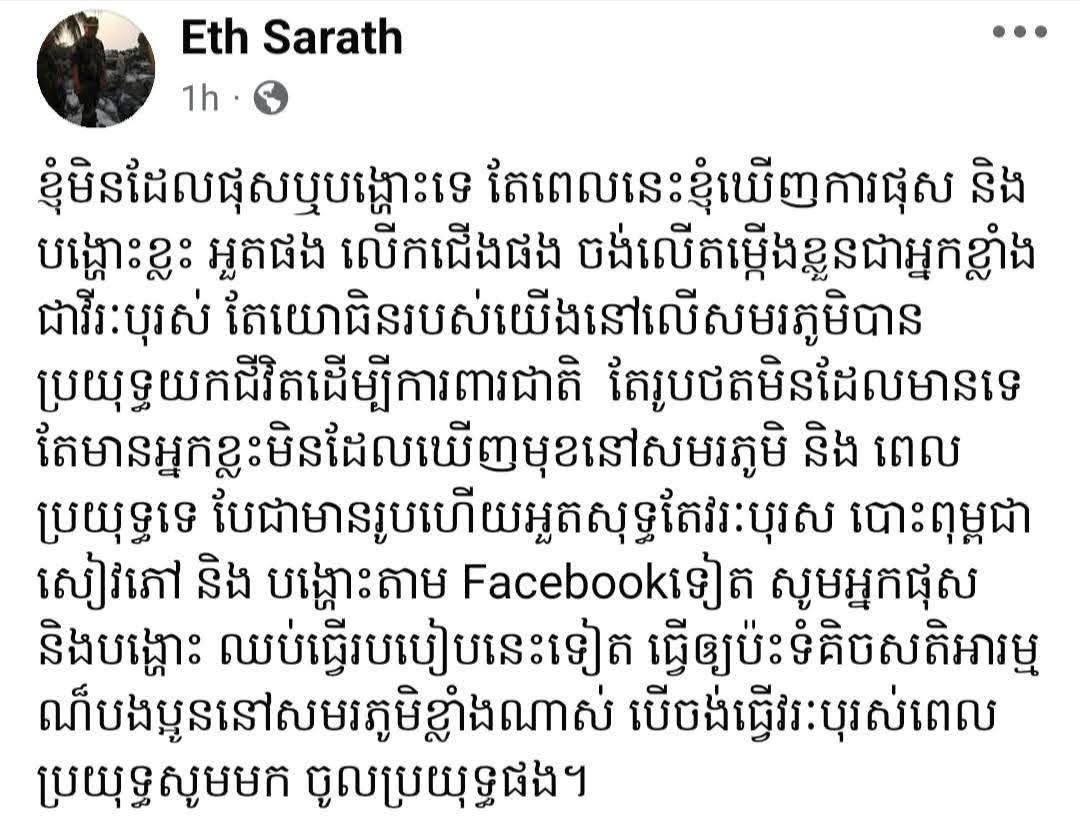 ភ្នំពេញ៖ នាយឧត្តមសេនីយ៍ ឥត សារ៉ាត់ អគ្គមេបញ្ជារង នាយសេនាធិការចម្រុះ នៃកងយោធពលខេមរភូមិន្ទ បានបង្ហាញអារម្មណ៍លើបណ្តាញសង្គម ដោយស្នើឱ្យអ្នកដែលតែងតែបង្ហោះលើបណ្តាញសង្គម អួតអ្នកនេះជាវីរបុរស និងលើកតម្កើងខ្លួន សូមឈប់បង្ហោះទៅ ព្រោះធ្វើឱ្យប៉ះទង្គិចសតិអារម្មណ៍បងប្អូននៅសមរភូមិ ខ្លាំងណាស់ ។