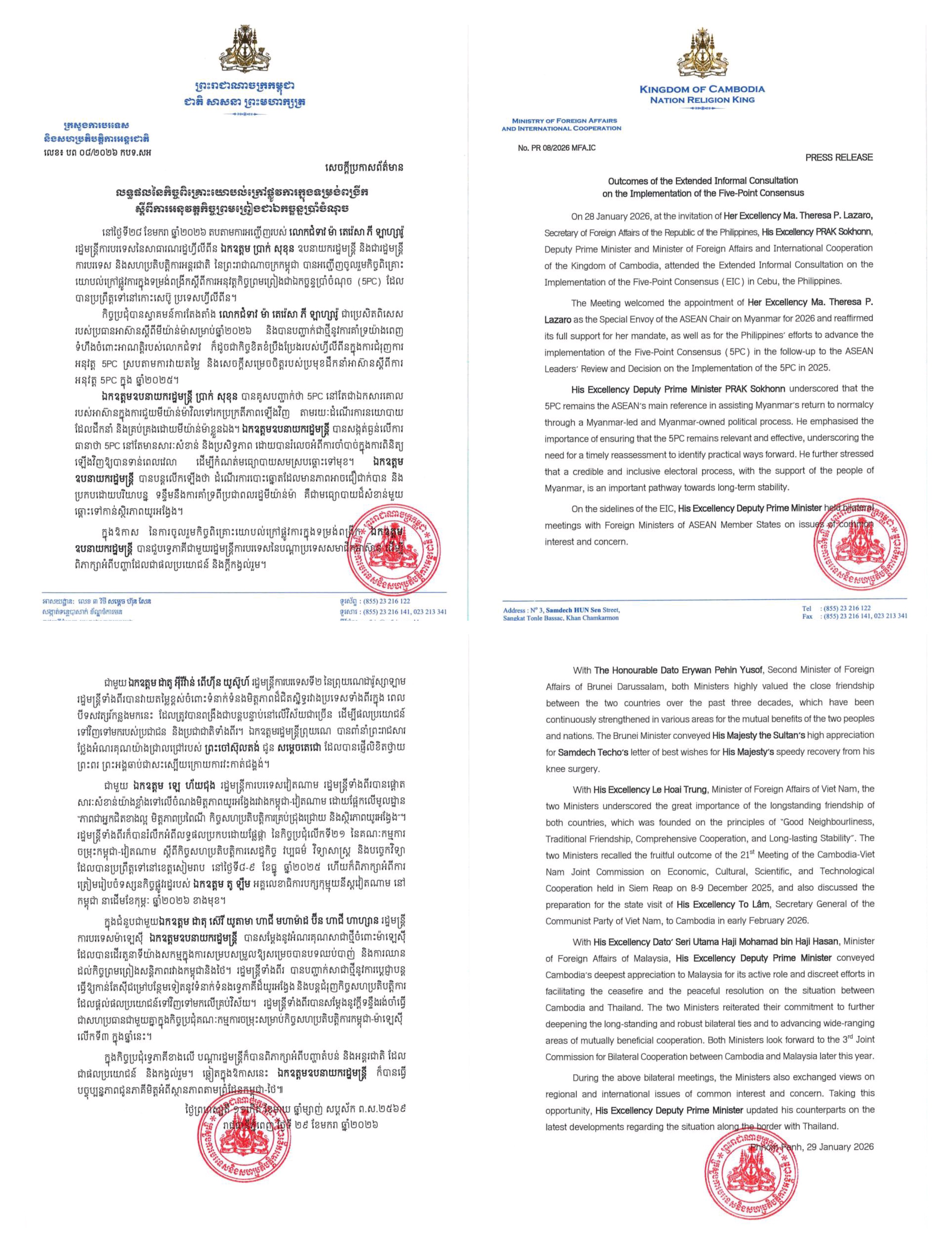 ភ្នំពេញ៖ ក្រសួងការបរទេស និងសហប្រតិបត្តិការអន្តរជាតិ នៅព្រឹកថ្ងៃទី២៩ ខែមករា ឆ្នាំ២០២៦នេះ បានឱ្យដឹងថា តបតាមការអញ្ជើញរបស់ លោកស្រី ម៉ា តេរ៉េសា ភី ឡាហ្សារ៉ូ រដ្ឋមន្ត្រីការបរទេសនៃសាធារណរដ្ឋហ្វីលីពីន លោក ប្រាក់ សុខុន ឧបនាយករដ្ឋមន្ត្រី និងជារដ្ឋមន្ត្រី ការបរទេស និងសហប្រតិបត្តិការអន្តរជាតិ នៃព្រះរាជាណាចក្រកម្ពុជា កាលពីថ្ងៃទី២៨ ខែមករា ឆ្នាំ២០២៦ បានអញ្ជើញចូលរួមកិច្ចពិគ្រោះ យោបល់ក្រៅផ្លូវការក្នុងទម្រង់ពង្រីកស្តីពីការអនុវត្តកិច្ចព្រមព្រៀងជាឯកច្ឆន្ទប្រាំចំណុច បានប្រព្រឹត្តទៅនៅកោះសេប៊ូ ប្រទេសហ្វីលីពីន។ (5PC) ដែល