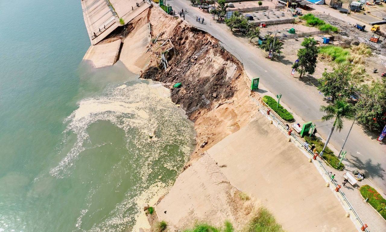 -ផ្នែកខាងក្រោម បាក់ស្រុតសំណង់បេតុងទប់ច្រាំង បណ្តោយប្រវែងប្រមាណ ៧០ម៉ែត្រ ទទឹង ៣២ម៉ែត្រ ចូលទឹកទន្លេទាំងស្រុង។