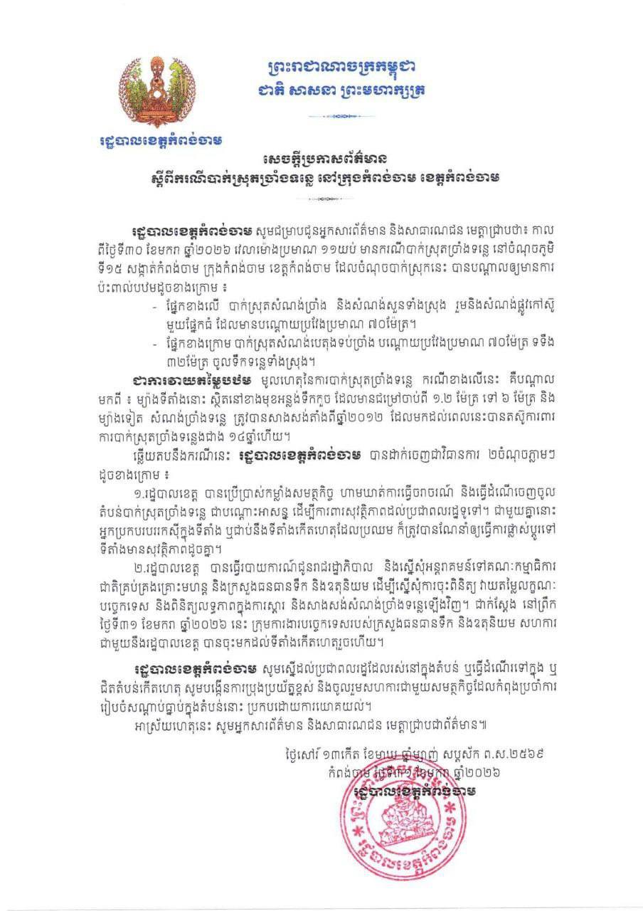 ខេត្តកំពង់ចាម៖ រដ្ឋបាលខេត្តកំពង់ចាម នៅថ្ងៃទី៣១ ខែមករា ឆ្នាំ២០២៦នេះ សូមជម្រាបជូនអ្នកសារព័ត៌មាន និងសាធារណជន មេត្តាជ្រាបថា៖ កាល ពីថ្ងៃទី៣០ ខែមករា ឆ្នាំ២០២៦ វេលាម៉ោងប្រមាណ ១១យប់ មានករណីបាក់ស្រុតច្រាំងទន្លេ នៅចំណុចភូមិ ទី១៥ សង្កាត់កំពង់ចាម ក្រុងកំពង់ចាម ខេត្តកំពង់ចាម ដែលចំណុចបាក់ស្រុកនេះ បានបណ្តាលឲ្យមានការ ប៉ះពាល់បឋមដូចខាងក្រោម៖