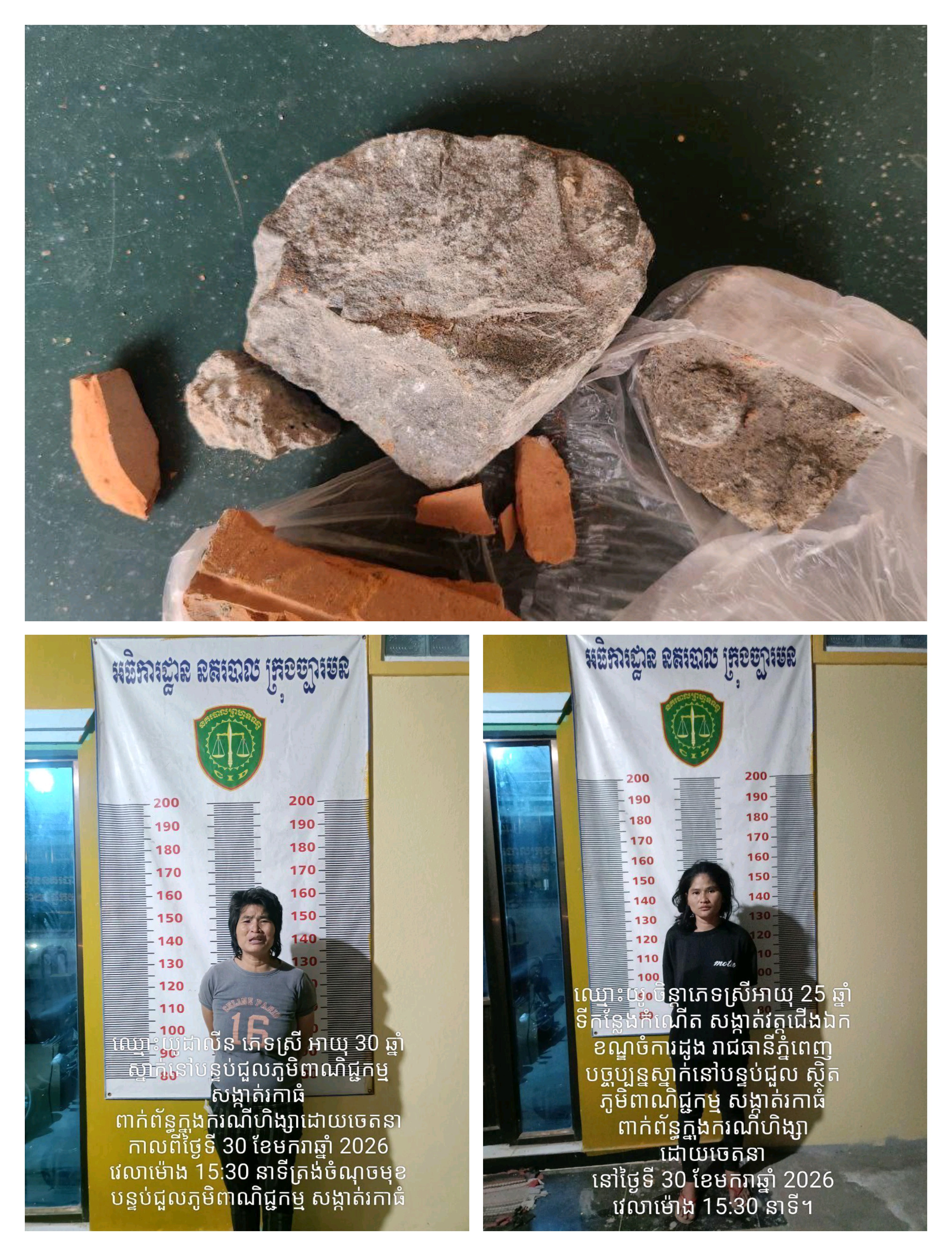 ករណីហិង្សាដោយចេតនាបង្កឡើងដោយនារីពីរនាក់បងប្អូនទៅលើស្ត្រីរងគ្រោះបានកើតឡើងកាលពីវេលាម៉ោង៥និង៣០នាទីល្ងាចថ្ងៃទី៣០ ខែមករា ឆ្នាំ២០២៦ នៅចំណុចបន្ទប់ជួល ក្នុងភូមិពាណិជ្ជកម្ម សង្កាត់រការធំ ក្រុងច្បារមន ខេត្តកំពង់ស្ពឺ ។