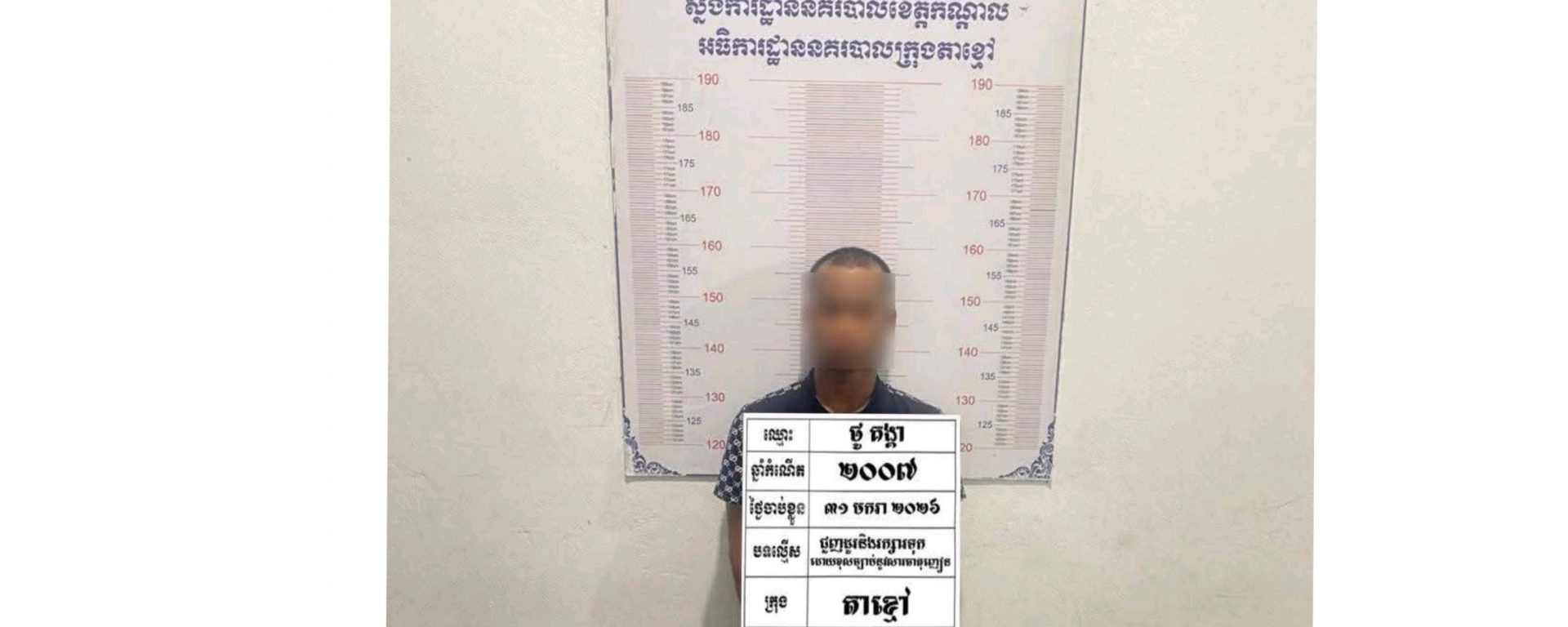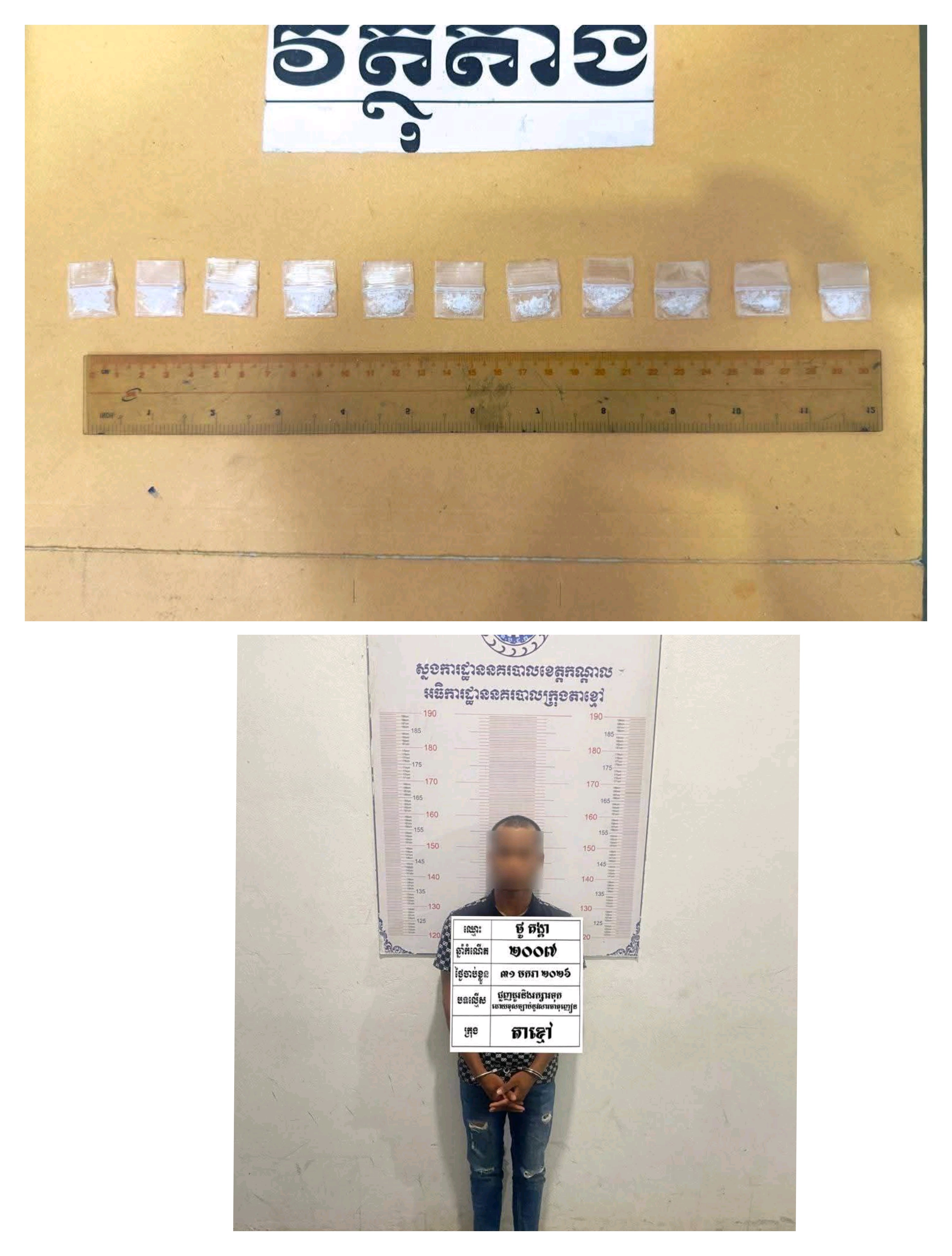 លោកវរសេនីយ៍ឯក យី វណ្ណដា អធិការនគរបាលក្រុងតាខ្មៅ បានឲ្យដឹងថា ជនសង្ស័យដែលត្រូវបានឃាត់ខ្លួនមានឈ្មោះ ថូ គង្គា ភេទប្រុស អាយុ១៩ឆ្នាំ ជនជាតិខ្មែរ មុខរបរមិនពិតប្រាកដ រស់នៅភូមិព្រែកឡុង សង្កាត់រកាខ្ពស់ ក្រុងតាខ្មៅ (មានសារធាតុញៀនក្នុងទឹកនោម)។ វត្ថុតាងដែលដកហូតបានរួមមាន ម្សៅក្រាមពណ៌សថ្លាសង្ស័យជាសារធាតុញៀន (ម៉ាទឹកកក) ចំនួន ១១កញ្ចប់ (ទម្ងន់ ០,៦២ក្រាម)។