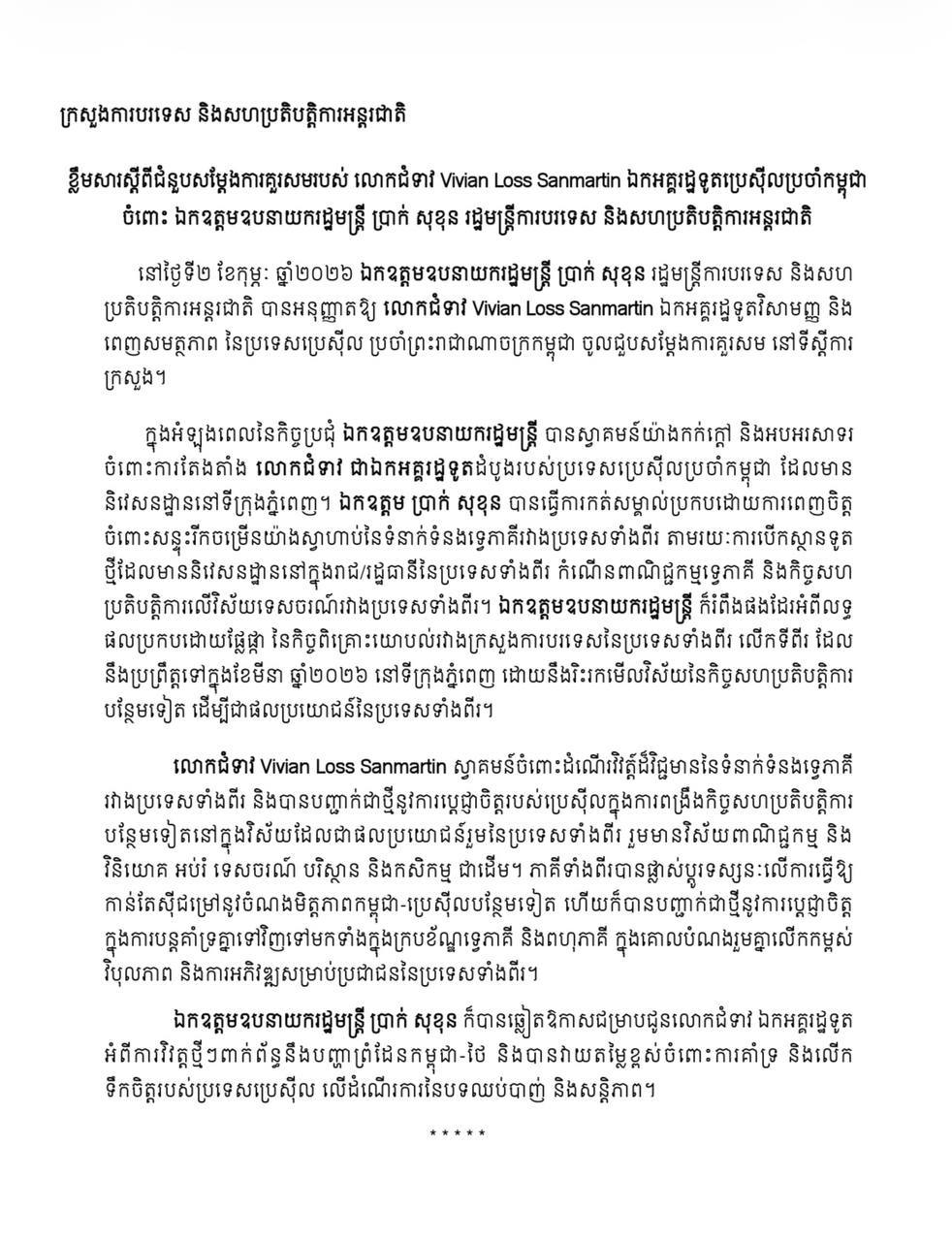 ភ្នំពេញ​៖​ លោកឧបនាយករដ្ឋមន្ត្រី ប្រាក់ សុខុន រដ្ឋមន្ត្រីការបរទេស និងសហ ប្រតិបត្តិការអន្តរជាតិ នៅថ្ងៃទី២ ខែកុម្ភៈ ឆ្នាំ២០២៦​ បានអនុញ្ញាតឱ្យ លោកស្រី Vivian Loss Sanmartin ឯកអគ្គរដ្ឋទូតវិសាមញ្ញ និង ពេញសមត្ថភាព នៃប្រទេសប្រេស៊ីល ប្រចាំព្រះរាជាណាចក្រកម្ពុជា ចូលជួបសម្តែងការគួរសម នៅទីស្តីការ ក្រសួង។
