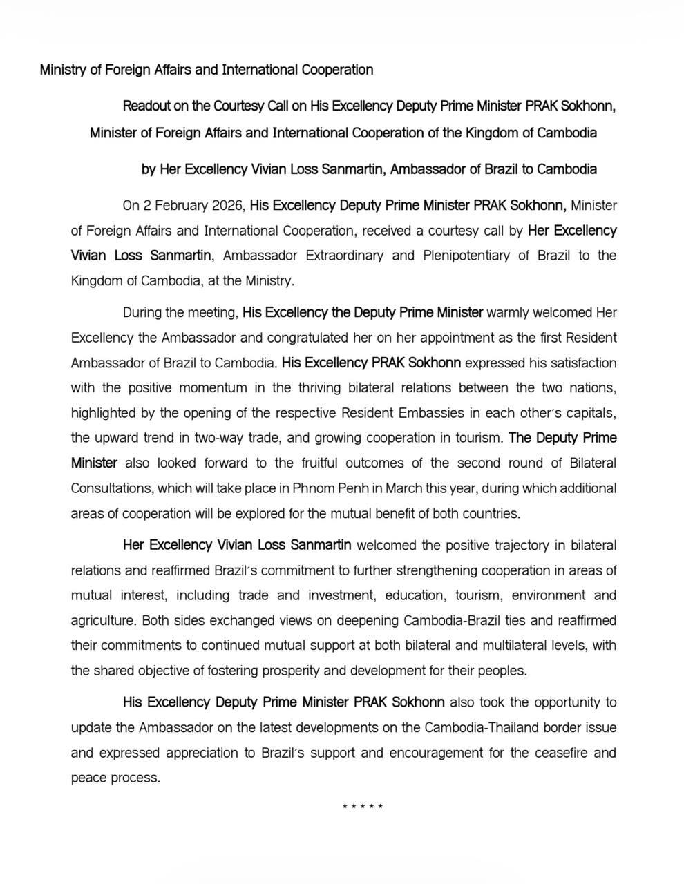 ក្នុងអំឡុងពេលនៃកិច្ចប្រជុំ ឯកឧត្តមឧបនាយករដ្ឋមន្ត្រី បានស្វាគមន៍យ៉ាងកក់ក្តៅ និងអបអរសាទរ ចំពោះការតែងតាំង លោកស្រី​ ជាឯកអគ្គរដ្ឋទូតដំបូងរបស់ប្រទេសប្រេស៊ីលប្រចាំកម្ពុជា ដែលមាន និវេសនដ្ឋាននៅទីក្រុងភ្នំពេញ។ លោក ប្រាក់ សុខុន បានធ្វើការកត់សម្គាល់ប្រកបដោយការពេញចិត្ត ចំពោះសន្ទុះរីកចម្រើនយ៉ាងស្វាហាប់នៃទំនាក់ទំនងទ្វេភាគីរវាងប្រទេសទាំងពីរ តាមរយៈការបើកស្ថានទូត ថ្មីដែលមាននិវេសនដ្ឋាននៅក្នុងរាជ/រដ្ឋធានីនៃប្រទេសទាំងពីរ កំណើនពាណិជ្ជកម្មទ្វេភាគី និងកិច្ចសហ ប្រតិបត្តិការលើវិស័យទេសចរណ៍រវាងប្រទេសទាំងពីរ។ លោកឧបនាយករដ្ឋមន្ត្រី ក៏រំពឹងផងដែរអំពីលទ្ធ ផលប្រកបដោយផ្លែផ្កា នៃកិច្ចពិគ្រោះយោបល់រវាងក្រសួងការបរទេសនៃប្រទេសទាំងពីរ លើកទីពីរ ដែល នឹងប្រព្រឹត្តទៅក្នុងខែមីនា ឆ្នាំ២០២៦ នៅទីក្រុងភ្នំពេញ ដោយនឹងរិះរកមើលវិស័យនៃកិច្ចសហប្រតិបត្តិការ បន្ថែមទៀត ដើម្បីជាផលប្រយោជន៍នៃប្រទេសទាំងពីរ។