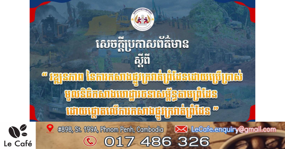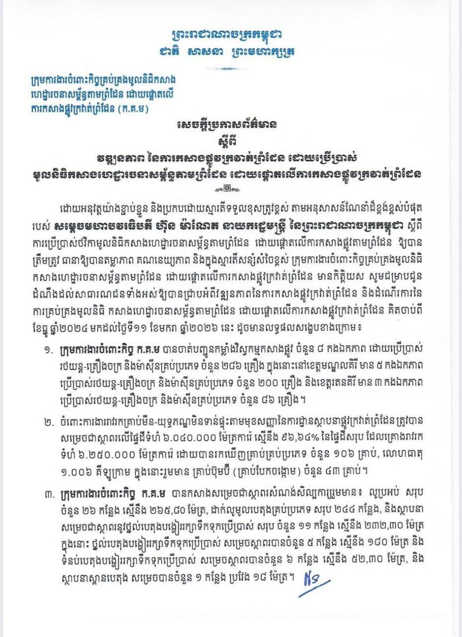 ព្រំដែន​៖​ ដោយអនុវត្តយ៉ាងខ្ជាប់ខ្ជួន និងប្រកបដោយស្មារតីទទួលខុសត្រូវខ្ពស់ តាមអនុសាសន៍ណែនាំដ៏ខ្ពង់ខ្ពស់បំផុតរបស់ សម្តេចមហាបវរធិបតី ហ៊ុន ម៉ាណែត នាយករដ្ឋមន្ត្រី នៃព្រះរាជាណាចក្រកម្ពុជា ស្តីពី ការប្រើប្រាស់ថវិកាមូលនិធិកសាងហេដ្ឋារចនាសម្ព័ន្ធតាមព្រំដែន ដោយផ្តោតលើការកសាងផ្លូវតាមព្រំដែន ឱ្យបាន ត្រឹមត្រូវ ធានាឱ្យបានតម្លាភាព គណនេយ្យភាព និងក្នុងស្មារតីសន្សំសំចៃខ្ពស់ ក្រុមការងារចំពោះកិច្ចគ្រប់គ្រងមូលនិធិ កសាងហេដ្ឋារចនាសម្ព័ន្ធតាមព្រំដែន ដោយផ្តោតលើការកសាងផ្លូវក្រវាត់ព្រំដែន មានកិត្តិយស សូមជម្រាបជូន ដំណឹងដល់សាធារណជនទាំងអស់ឱ្យបានជ្រាបអំពីវឌ្ឍនភាពនៃការកសាងផ្លូវក្រវាត់ព្រំដែន និងដំណើរការនៃ ការគ្រប់គ្រងមូលនិធិ កសាងហេដ្ឋារចនាសម្ព័ន្ធតាមព្រំដែន ដោយផ្តោតលើការកសាងផ្លូវក្រវាត់ព្រំដែន គិតចាប់ពី ខែធ្នូ ឆ្នាំ២០២៤ មកដល់ថ្ងៃទី១១ ខែមករា ឆ្នាំ២០២៦ នេះ ដូចមានលទ្ធផលសង្ខេបខាងក្រោម៖